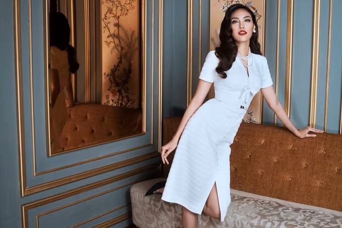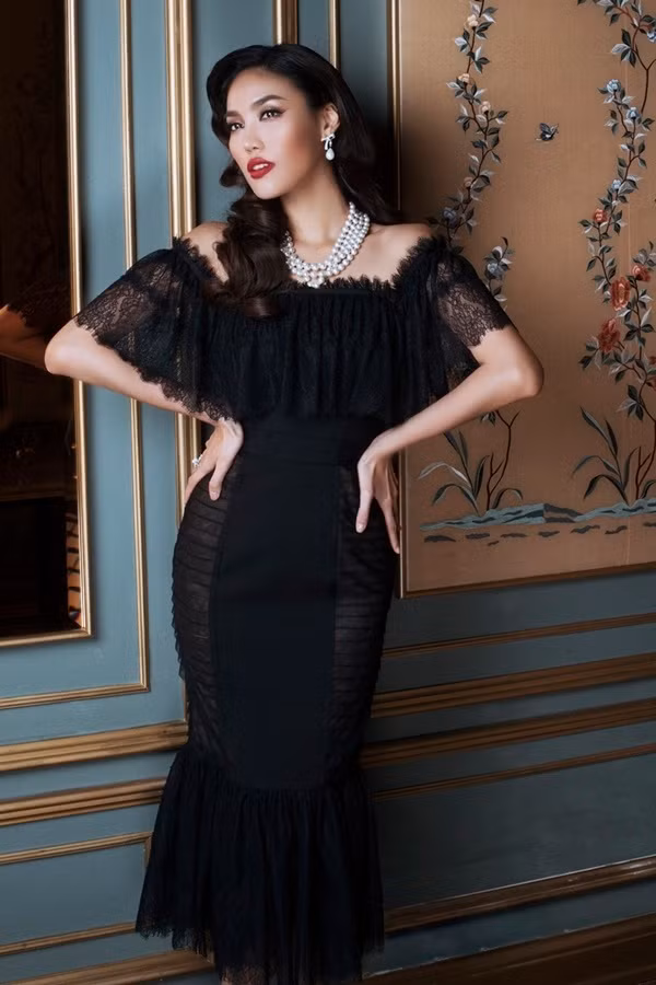 Huấn luyện viên The Face diện đầm trễ vai với thiết kế ren xuyên thấu của nhà thiết kế Lâm Thuận.