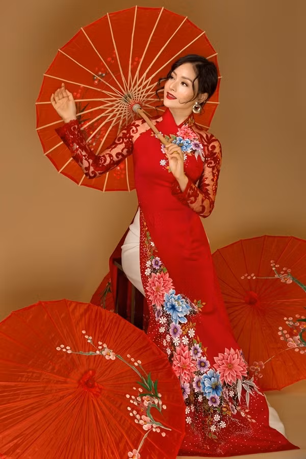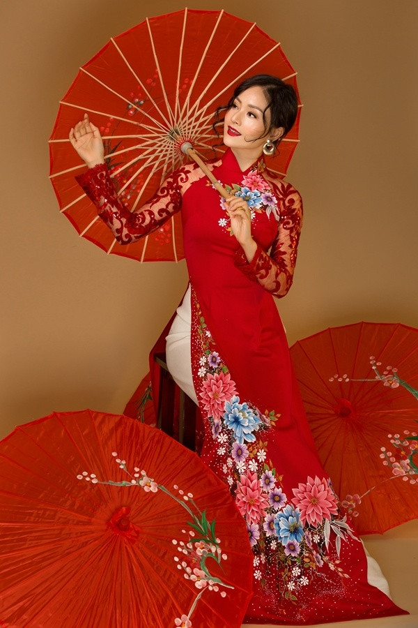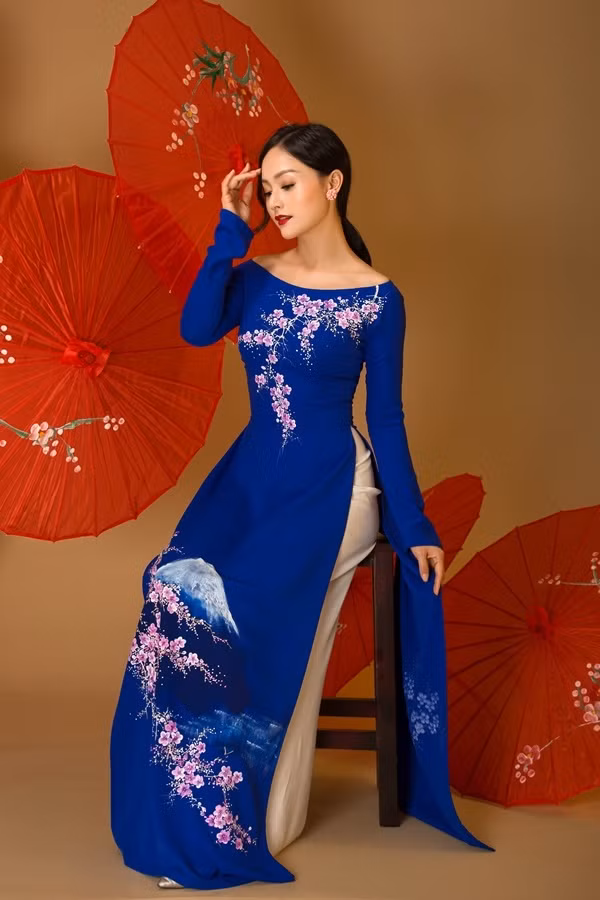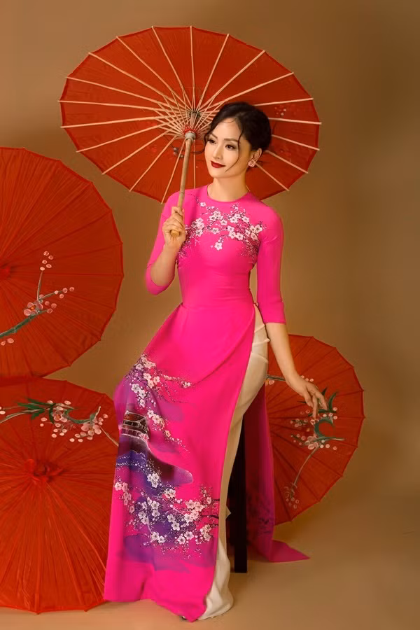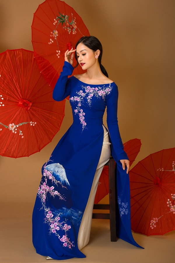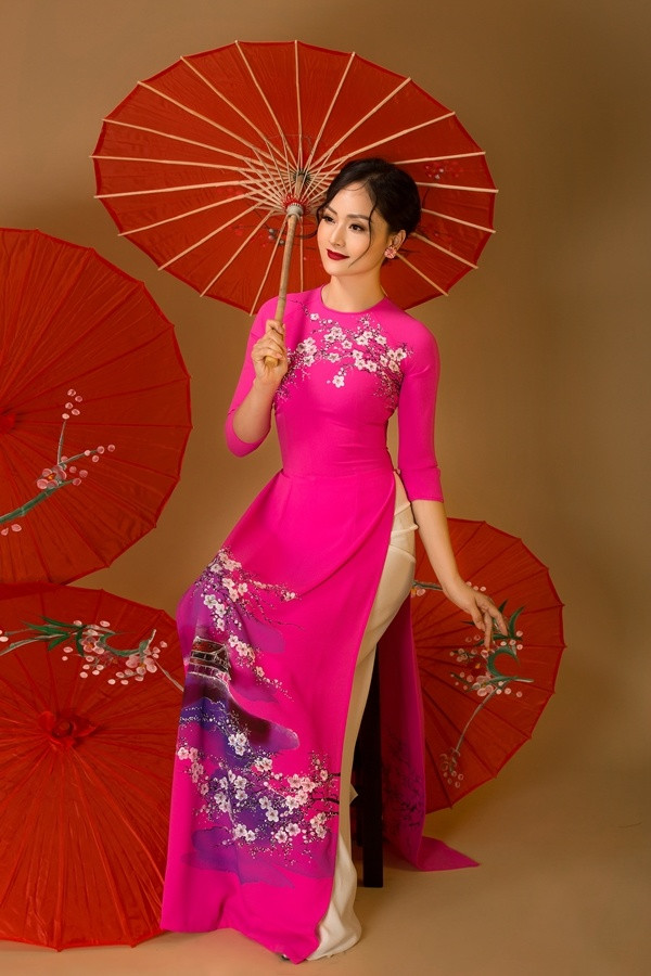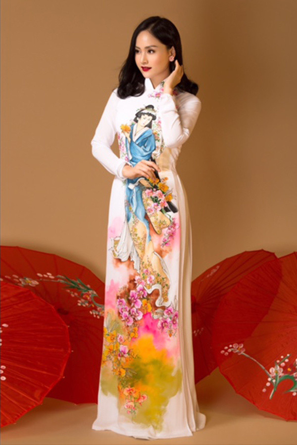 Áo dài có các họa tiết gợi hình ảnh đất nước Nhật của nhà thiết kế Đan Hà.