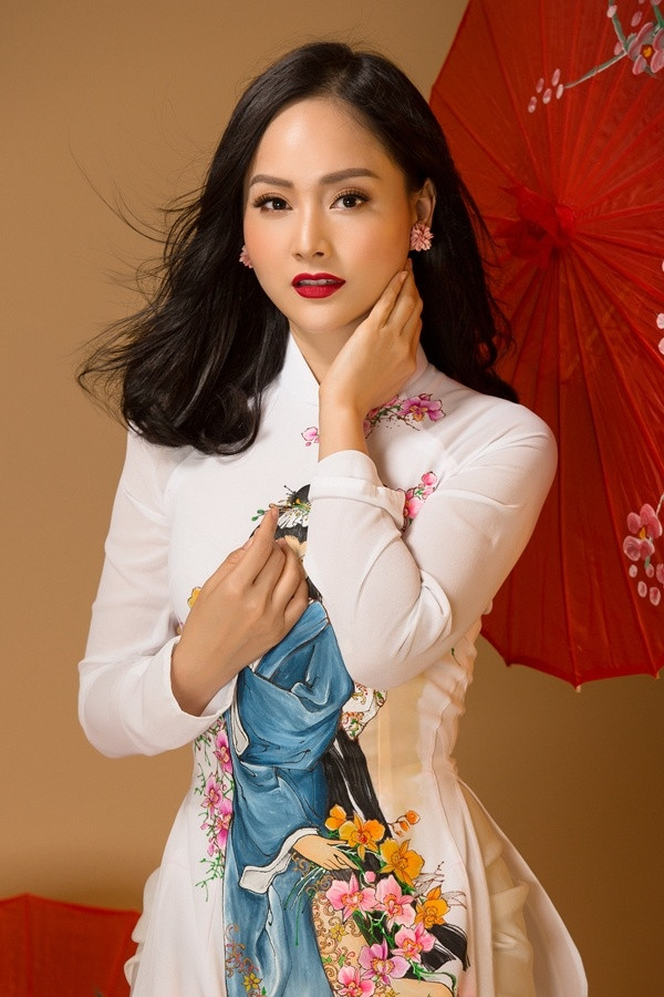 Lan Phương mặc áo dài họa tiết phối cùng khuyên tai kim loại, để tóc búi và thả lọn.