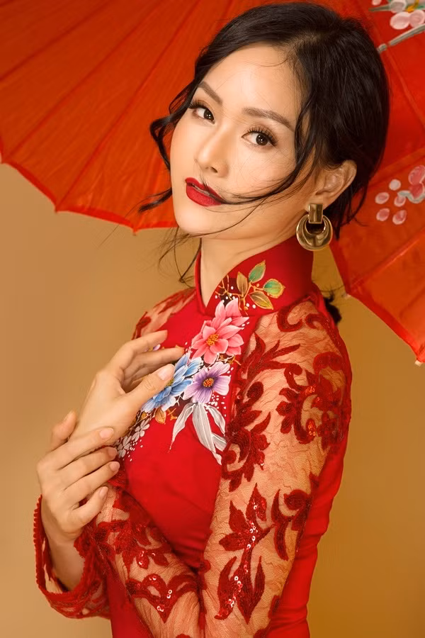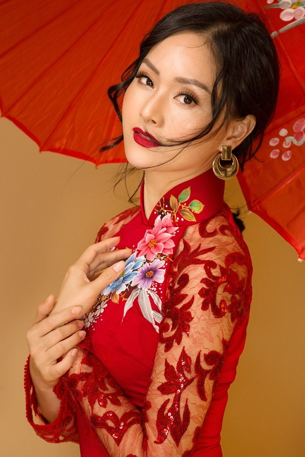 Cô kẻ chân mày và eyeliner nhẹ, chọn màu son đỏ làm điểm nhấn.