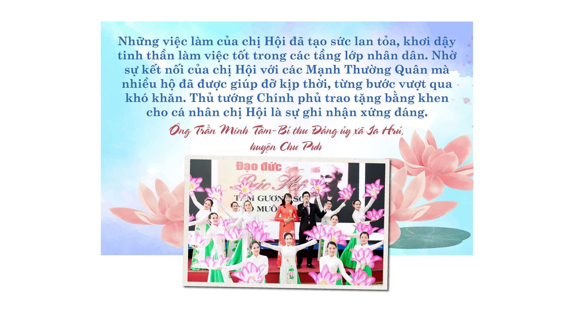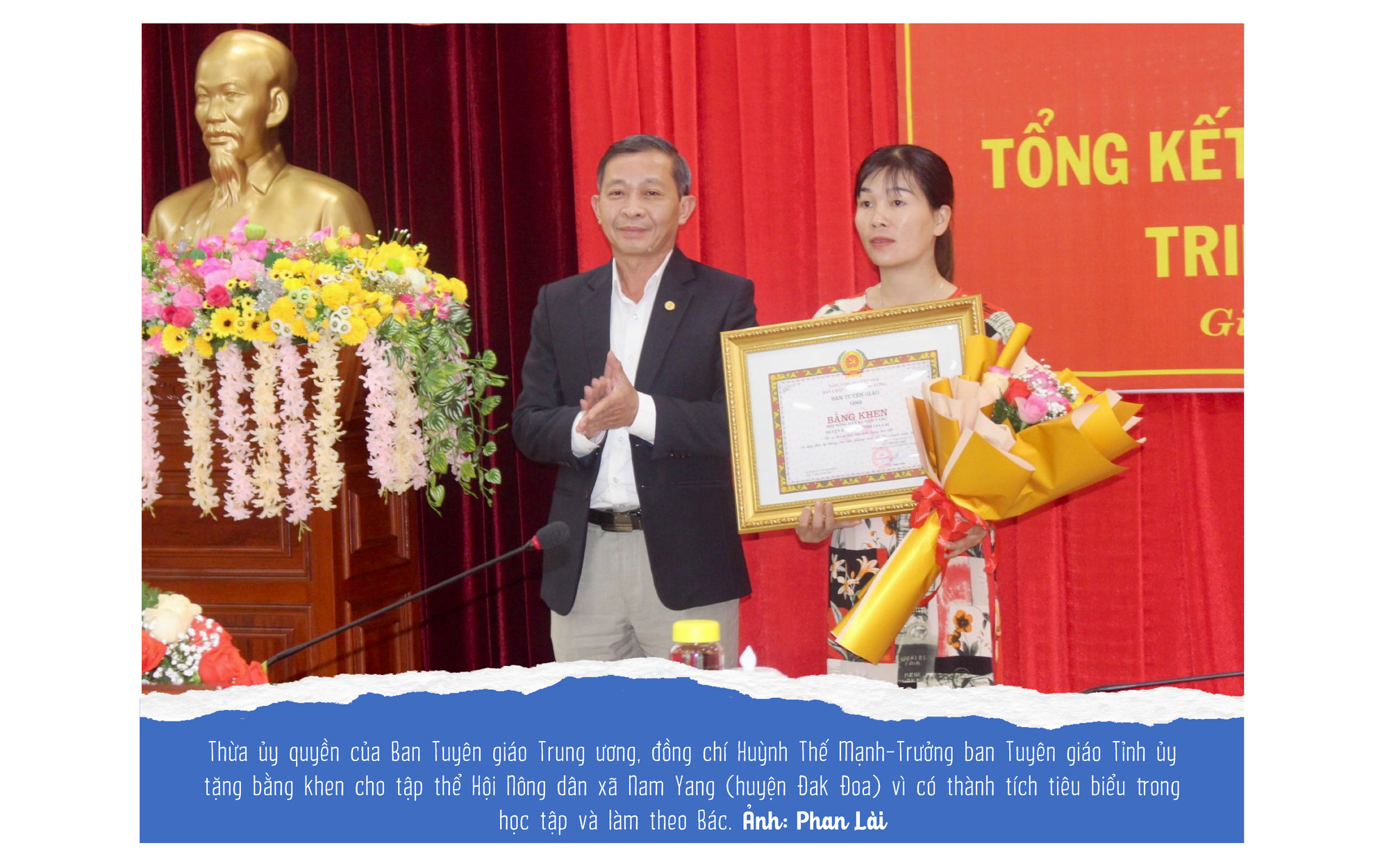Không thể kể hết gương người tốt-việc tốt, tập thể tiên tiến, điển hình xuất sắc đã có những việc làm thiết thực, tốt đẹp, được cấp ủy, chính quyền các cấp ghi nhận, biểu dương. Họ chính là những bông hoa đẹp lan tỏa ngày càng sâu rộng phong trào học tập và làm theo Bác trong cộng đồng.