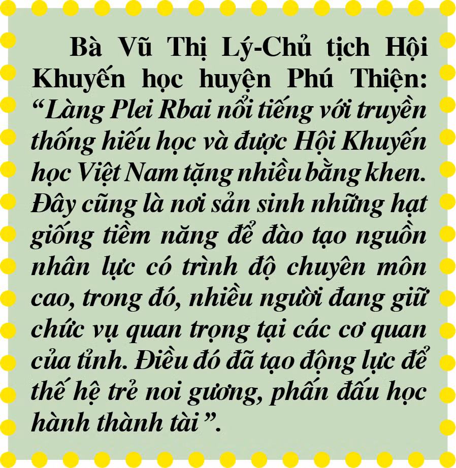 Trên đường dẫn chúng tôi đi thăm các gia đình hiếu học ở Plei Rbai, Trưởng thôn Nay Keng và Chủ tịch Hội Khuyến học xã Nguyễn Thị Khá hào hứng chia sẻ về truyền thống học hành của làng. “Làng có 88% hộ dân là người Jrai, đời sống còn nhiều khó khăn, vất vả. Thế nhưng, tinh thần hiếu học thì xếp nhất nhì huyện. Theo nhẩm tính của tôi thì làng có trên 100 người có bằng đại học, cao đẳng và 2-3 người có học vị thạc sĩ, tiến sĩ”-bà Khá cho hay.