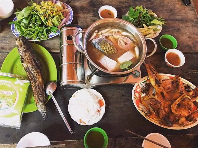 Dạo một vòng các bạn sẽ trở lại bến xuồng, xuống thuyền để đi vào sâu bên trong và thưởng thức đặc sản nơi đây. Phía trong có nhà hàng với những món ăn đặc sản, dân dã đậm chất nam Bộ như: chuột đồng nướng lu, lươn nướng ghiền, ếch chiên xù, ếch nướng mọi, cá lóc nướng chui, gà chạy bộ nướng muối ớt, lẩu cua đồng, lẩu mắm,... đảm bảo cực ngon và giá cả khá mềm.