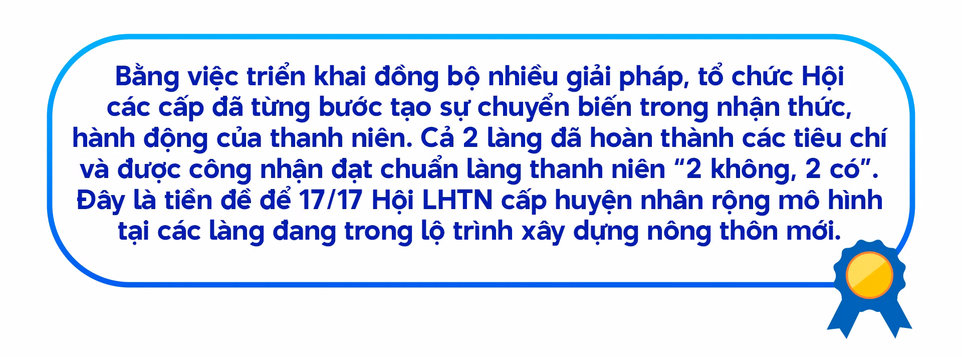 Theo thống kê của Hội LHTN Việt Nam tỉnh, đến nay, 100% làng thanh niên “2 không, 2 có” duy trì mô hình vần đổi công giúp nhau làm kinh tế đạt hiệu quả và tạo nguồn quỹ cho hoạt động Đoàn-Hội. Trong Tháng Thanh niên, Chiến dịch thanh niên tình nguyện hè, chương trình “Tình nguyện mùa đông-Xuân tình nguyện”, Ngày chủ nhật xanh… đã có hơn 10.000 lượt thanh niên tham gia hỗ trợ các làng thực hiện tiêu chí 17.3 về “Xây dựng cảnh quan môi trường sáng-xanh-sạch-đẹp-an toàn”.
