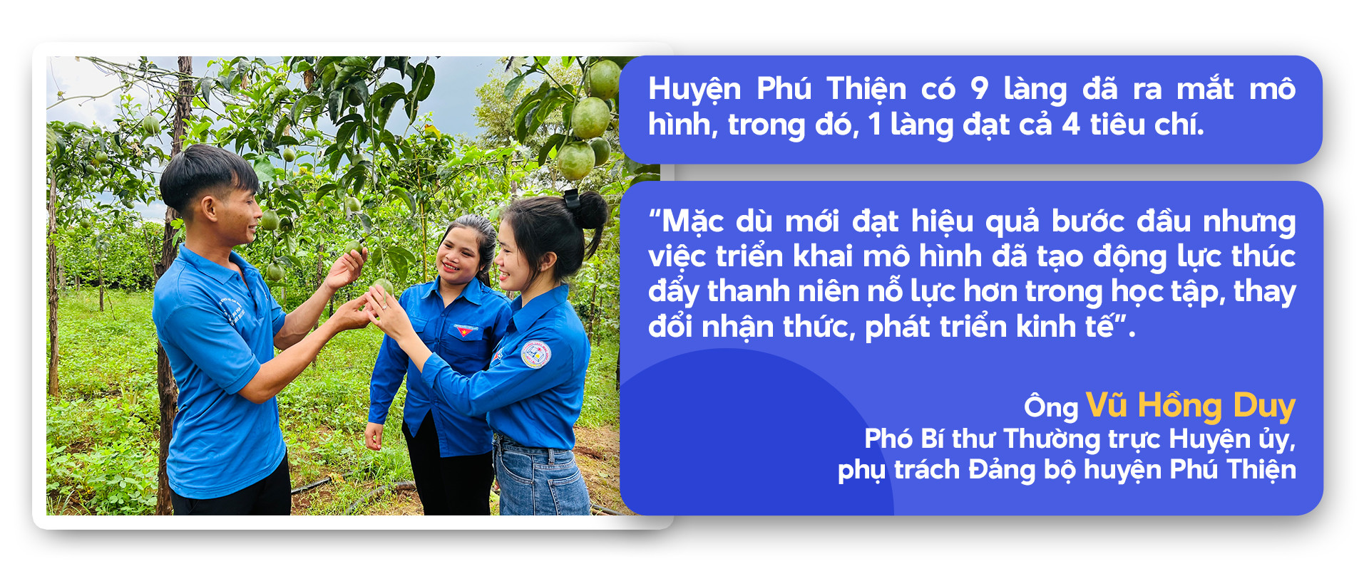 Huyện ủy, UBND huyện rất quan tâm đến việc triển khai, nhân rộng mô hình này. Huyện ủy đã chỉ đạo các ban, ngành, đoàn thể các cấp thường xuyên phối hợp với tổ chức Đoàn-Hội triển khai hội nghị tập huấn và hỗ trợ nguồn lực, định hướng thanh niên khởi nghiệp, lập nghiệp; khơi dậy tinh thần tích cực của thanh niên, giúp phát huy hiệu quả tiềm năng đất đai, gìn giữ và phát huy giá trị truyền thống văn hóa tốt đẹp của địa phương.