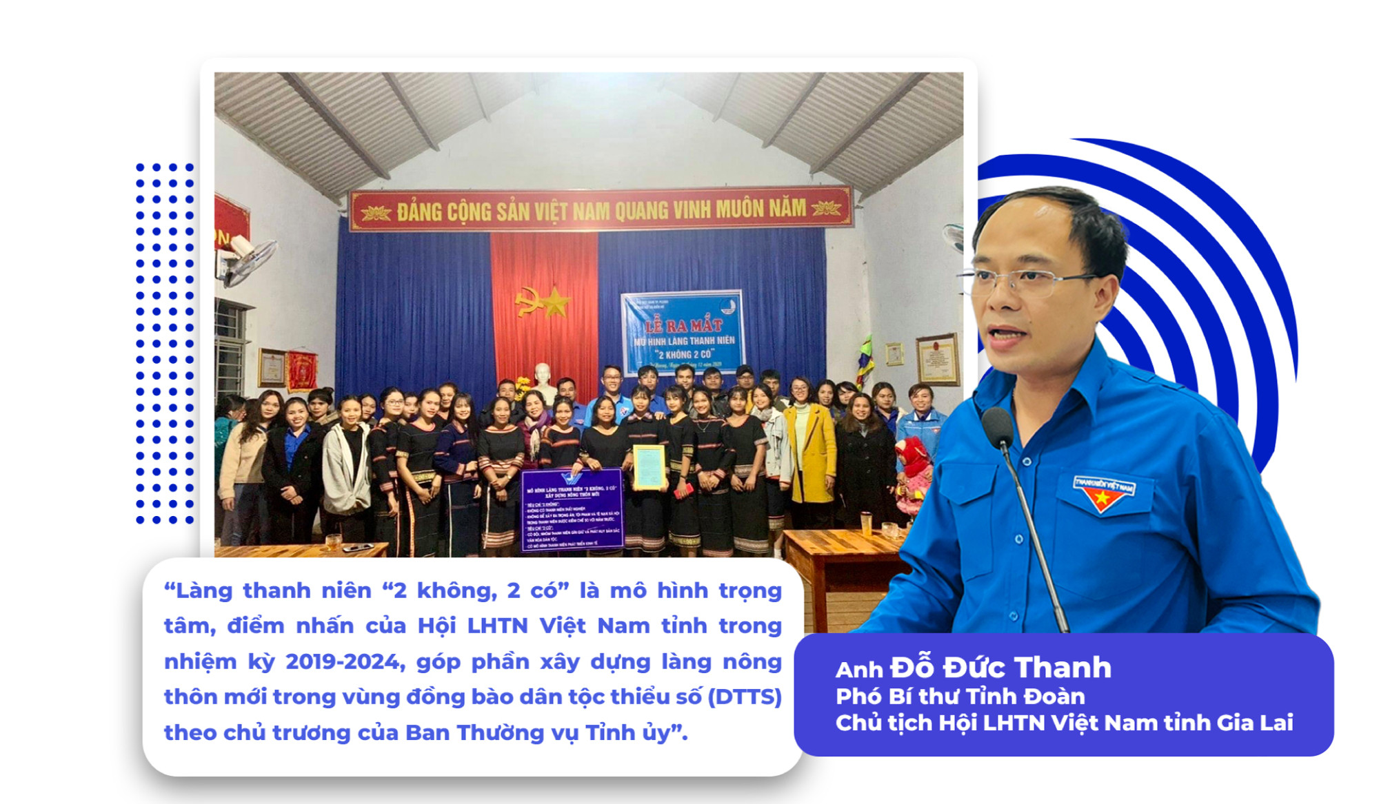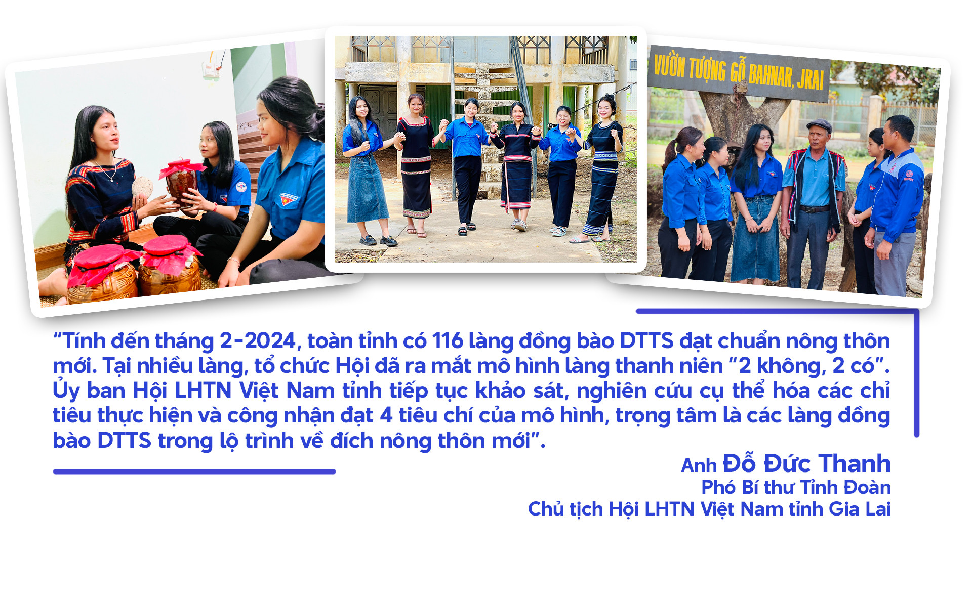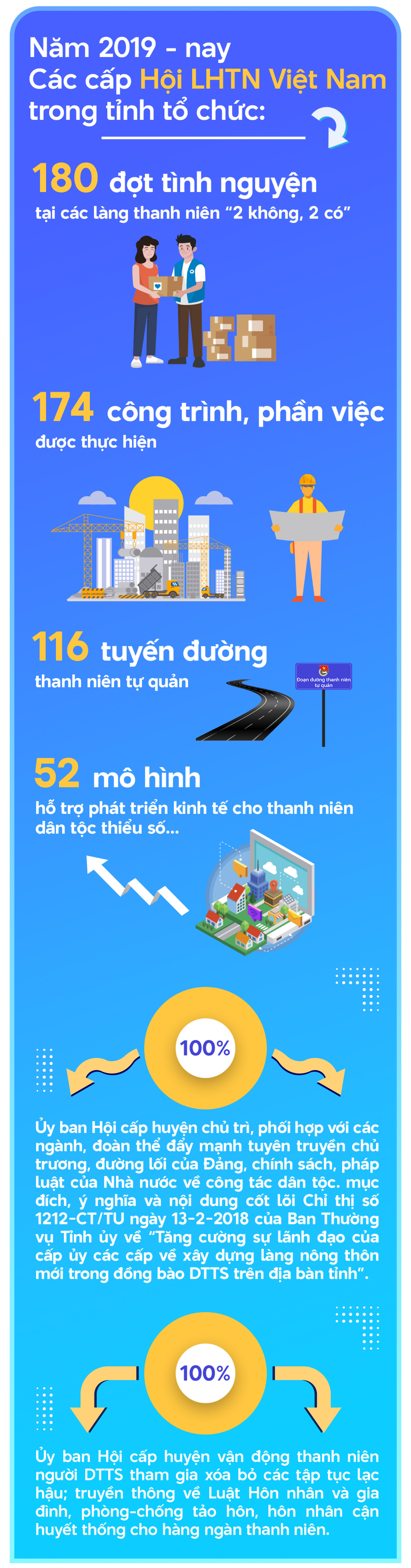 Theo số liệu thống kê từ Ủy ban Hội LHTN Việt Nam tỉnh, từ năm 2019 đến nay, tổ chức Hội các cấp trong toàn tỉnh đã tổ chức 180 đợt tình nguyện tại các làng được chọn ra mắt mô hình làng thanh niên “2 không, 2 có”; thực hiện 174 công trình, phần việc thanh niên; xây dựng và duy trì hiệu quả 116 tuyến đường thanh niên tự quản; hỗ trợ 52 mô hình phát triển kinh tế cho thanh niên dân tộc thiểu số... Bên cạnh đó, 100% Ủy ban Hội cấp huyện chủ trì, phối hợp với các ngành, đoàn thể đẩy mạnh tuyên truyền chủ trương, đường lối của Đảng, chính sách, pháp luật của Nhà nước về công tác dân tộc; mục đích, ý nghĩa và nội dung cốt lõi Chỉ thị số 1212-CT/TU ngày 13-2-2018 của Ban Thường vụ Tỉnh ủy về “Tăng cường sự lãnh đạo của cấp ủy các cấp về xây dựng làng nông thôn mới trong đồng bào DTTS trên địa bàn tỉnh”; vận động thanh niên người DTTS tham gia xóa bỏ các tập tục lạc hậu; truyền thông về Luật Hôn nhân và gia đình, phòng-chống tảo hôn, hôn nhân cận huyết thống cho hàng ngàn thanh niên.