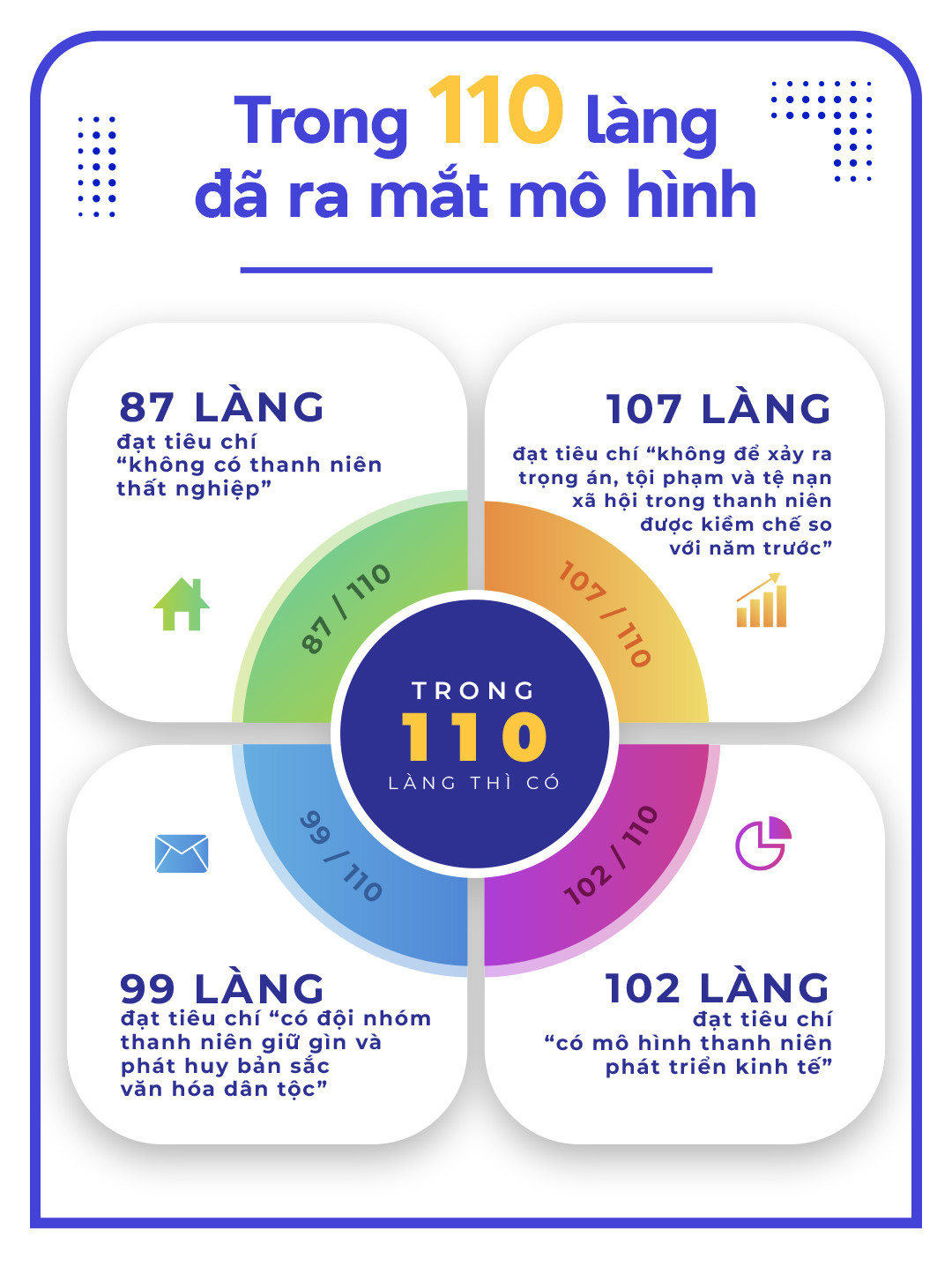 Trong 110 làng đã ra mắt mô hình, 87 làng đạt tiêu chí “không có thanh niên thất nghiệp”; 107 làng đạt tiêu chí “không để xảy ra trọng án, tội phạm và tệ nạn xã hội trong thanh niên được kiềm chế so với năm trước”; 99 làng đạt tiêu chí “có đội nhóm thanh niên giữ gìn và phát huy bản sắc văn hóa dân tộc”, 102 làng đạt tiêu chí “có mô hình thanh niên phát triển kinh tế”.