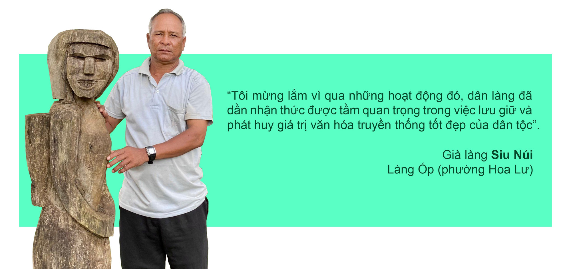 Thực trạng ấy khiến những người nặng lòng với văn hóa truyền thống của dân tộc không khỏi trăn trở, đau đáu tìm giải pháp bảo tồn, để làng hòa nhập mà không bị hòa tan. Trong câu chuyện bảo tồn văn hóa của mình, già làng Siu Núi vẫn còn nhớ những ngày ròng rã tuyên truyền, thuyết phục dân làng tham gia phục dựng các lễ hội truyền thống. Bằng kinh nghiệm có được, ông đứng ra chủ trì, đồng thời hướng dẫn cho bà con về quy trình thực hiện, lễ vật cần chuẩn bị và ý nghĩa của từng lễ cúng. Cùng với đó, ông còn truyền dạy cho dân làng cách đánh cồng chiêng, tạc tượng, đan lát; động viên vợ mình cùng một số phụ nữ có khả năng dệt thổ cẩm đẹp trong làng tổ chức truyền dạy cho những người chưa biết.