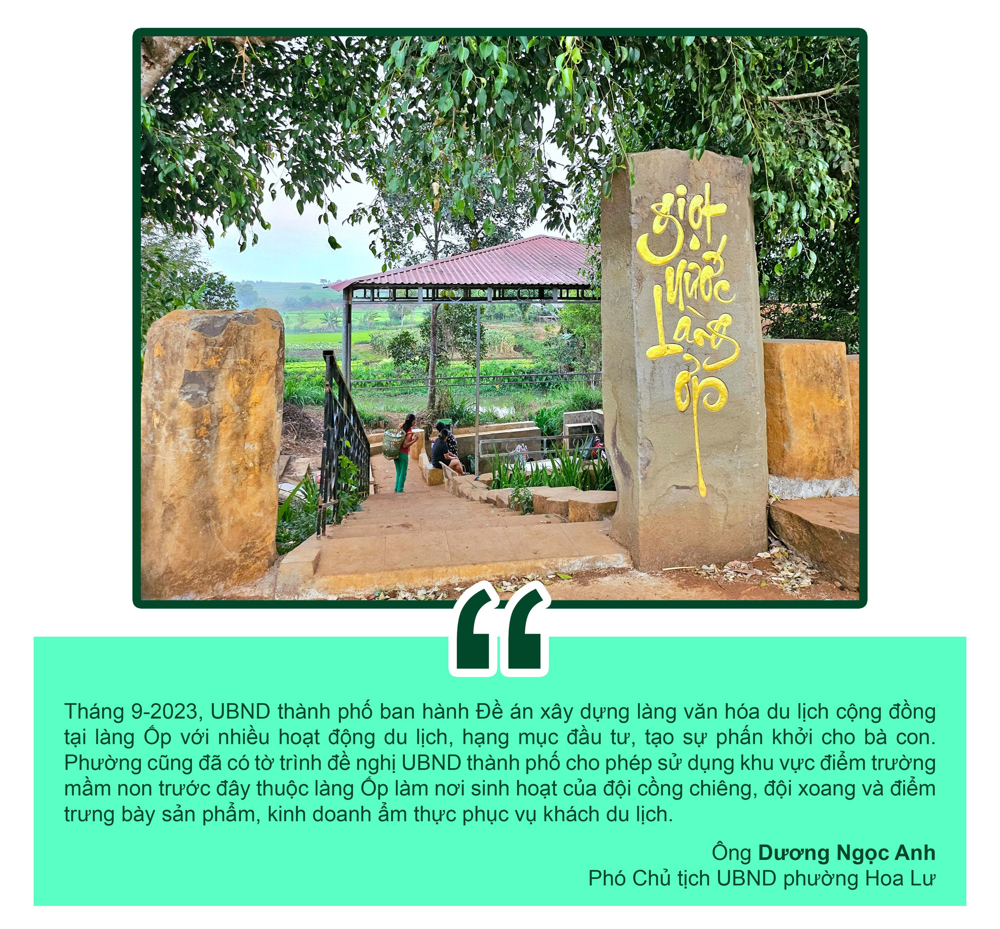 Tương tự, đến tận bây giờ, người dân làng Ốp (phường Hoa Lư) vẫn neo giữ ký ức về thuở lập làng như một dấu ấn đáng nhớ của ngôi làng trong phố. Già làng Siu Núi nhắc nhớ: “Ông nội tôi kể rằng, hồi đó, làng gốc Pleiku có 7 cái nhà rông to. Sau này tách ra thì mỗi làng tự làm nhà rông mới. Dân làng chúng tôi khi dời về vị trí này vào năm 1927 cũng bắt đầu chung tay dựng nhà rông, giọt nước. Những nghi lễ, tín ngưỡng văn hóa truyền thống như: cúng mừng nhà rông mới, cúng giọt nước, lễ bỏ mả, cúng mừng lúa mới hay nghề đan lát, tạc tượng, dệt thổ cẩm… vẫn được bà con duy trì”.