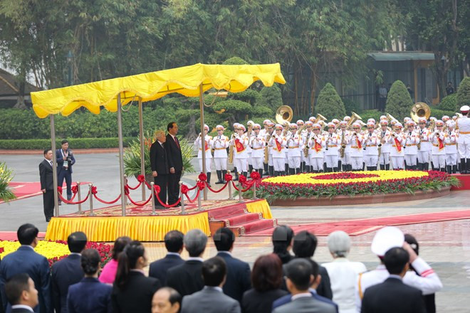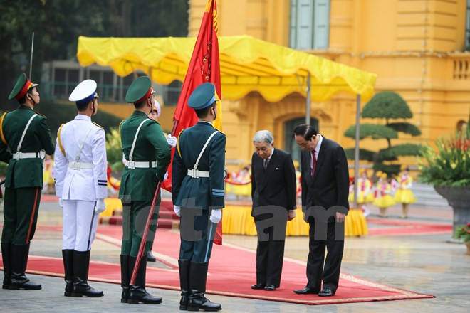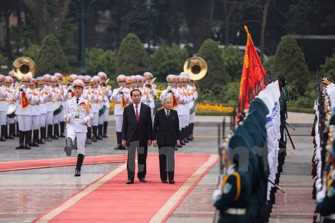 Chủ tịch nước Trần Đại Quang nhiệt liệt chào mừng Nhà vua Akihito và Hoàng hậu Nhật Bản thăm cấp Nhà nước tới Việt Nam. Trong tiếng nhạc chào mừng, Chủ tịch nước Trần Đại Quang mời Nhà vua bước lên bục danh dự. Quân nhạc cử Quốc thiều hai nước. Tiếp đó, Chủ tịch nước Trần Đại Quang mời Nhà vua Akihito duyệt đội danh dự Quân đội nhân dân Việt Nam.
