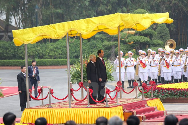 Sáng nay (1-3) lễ đón chính thức Nhà vua và Hoàng hậu được tổ chức trọng thể tại Phủ Chủ tịch. Ngay sau lễ đón, Chủ tịch nước Trần Đại Quang đã hội kiến với Nhà vua Nhật Bản Akihito.