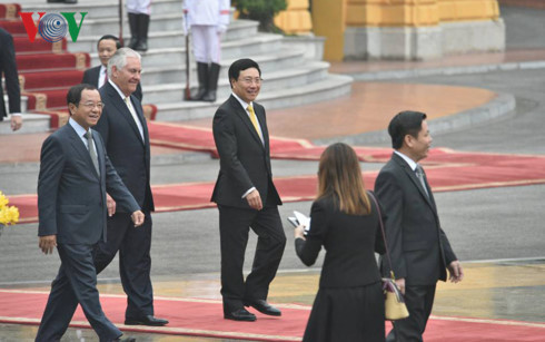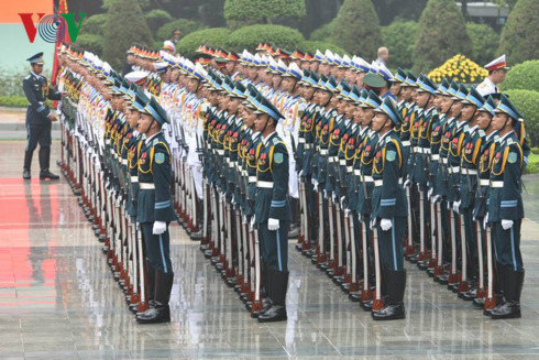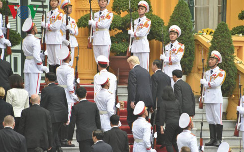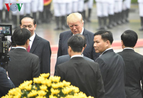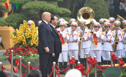 Chủ tịch nước Trần Đại Quang mời Tổng thống Hợp chủng quốc Hoa Kỳ Donald Trump duyệt đội danh dự Quân đội nhân dân Việt Nam.