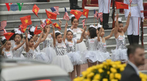 Các cháu thiếu nhi vẫy cờ hai nước Việt Nam, Hoa Kỳ.