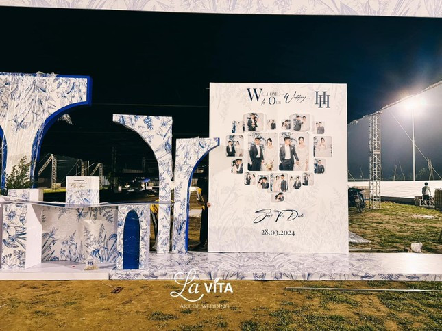 | Khu vực rạp cưới, lễ đường tại sân bóng tuổi thơ của Quang Hải. Tông màu chủ đạo của đám cưới là xanh dương và trắng. Ảnh: Lavita. |