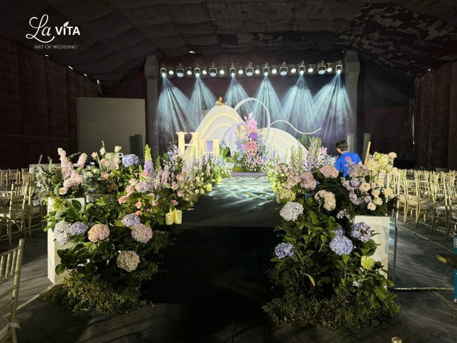 Hình ảnh cận cảnh về rạp cưới được đơn vị thiết kế thi công đăng tải. Theo đơn vị này, diện tích rạp cưới lên đến 2.000 m2, nguyên sân bóng sử dụng cho buổi tiệc. Lễ đường được trang trí 100% hoa tươi.