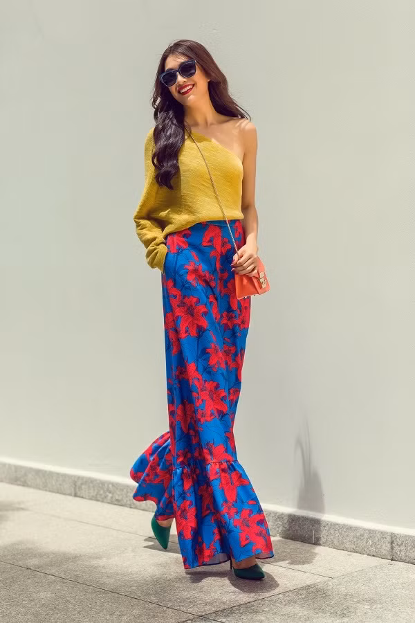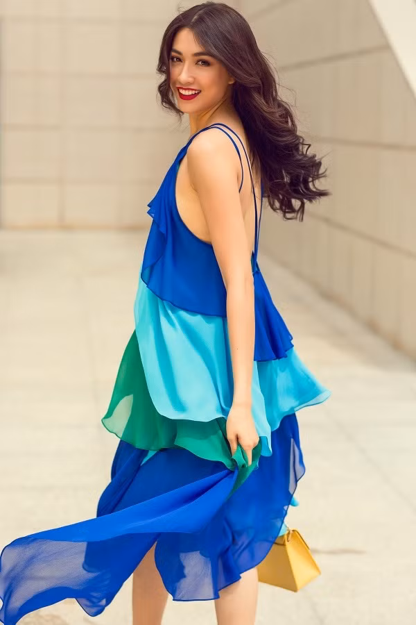 Á hậu dạo phố với váy chiffon nhiều màu. Chất liệu mỏng và nhẹ giúp người mặc thoải mái, thoáng mát trong những ngày hè.
