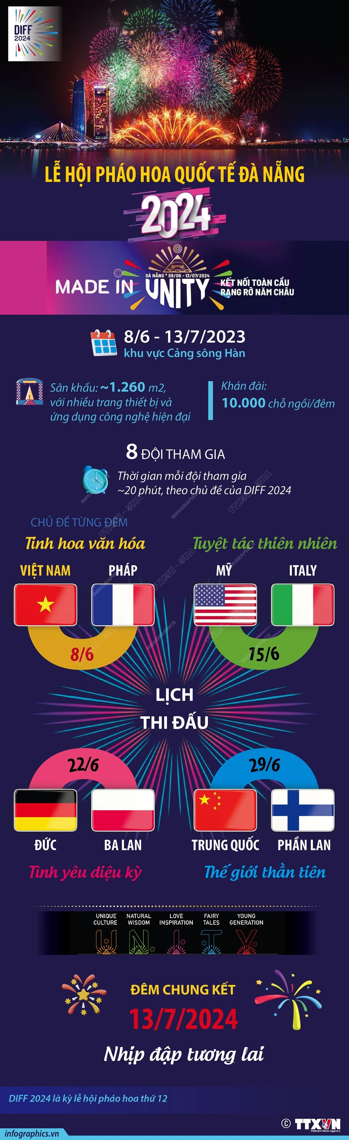 DIFF 2024 sẽ có 5 đêm trình diễn pháo hoa gắn với 5 chủ đề, 8 đội thi gồm Pháp, Italy, Mỹ, Đức, Ba Lan, Trung Quốc, Phần Lan và Việt Nam chia thành 4 cặp đấu cho 4 đêm, 2 đội xuất sắc nhất sẽ tranh tài trong trận chung kết vào ngày 13/7/2024.