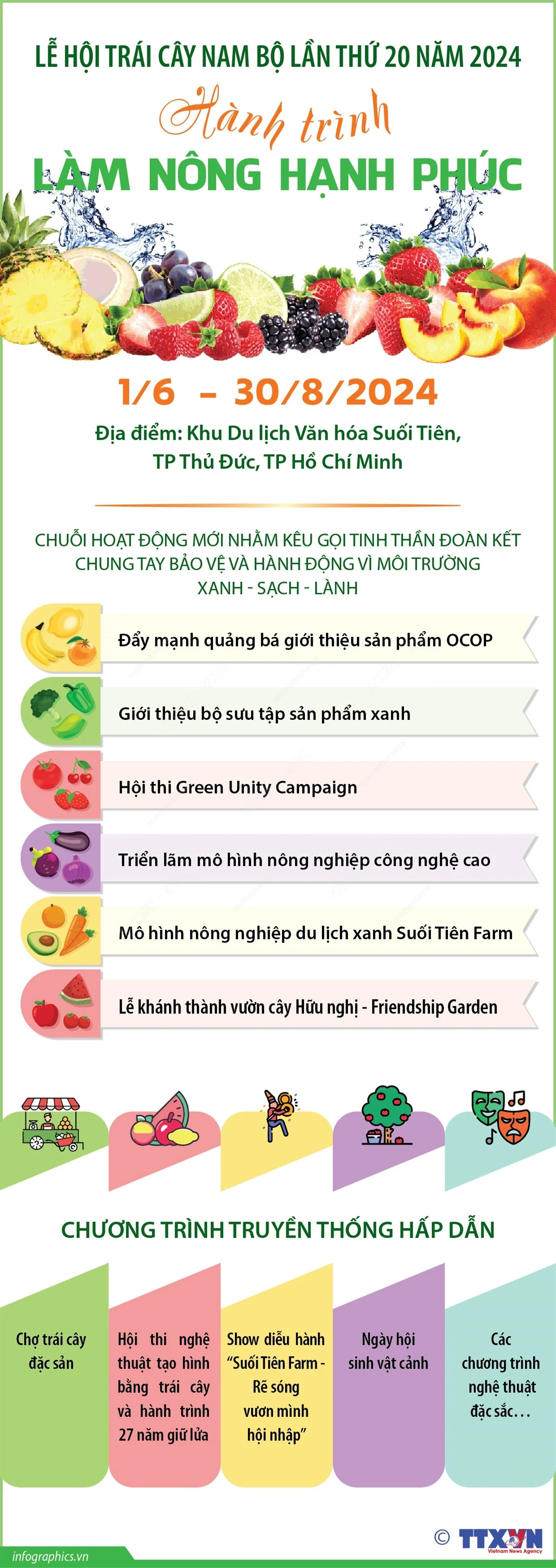 Lễ hội trái cây Nam Bộ lần thứ 20 năm 2024 với chủ đề “Hành trình làm nông hạnh phúc” diễn ra từ ngày 1/6-30/8, tại Khu Du lịch Văn hóa Suối Tiên, thành phố Thủ Đức, Thành phố Hồ Chí Minh với nhiều nét mới.