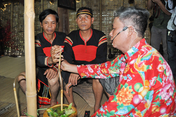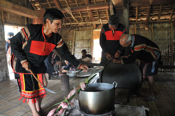 Từ sáng sớm những người tham dự lễ là họ hàng, người thân của hai người kết nghĩa và dân làng tề tựu để chuẩn bị cho nghi lễ quan trọng của dân tộc mình.