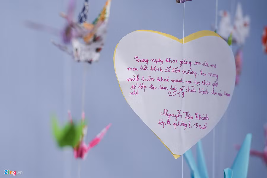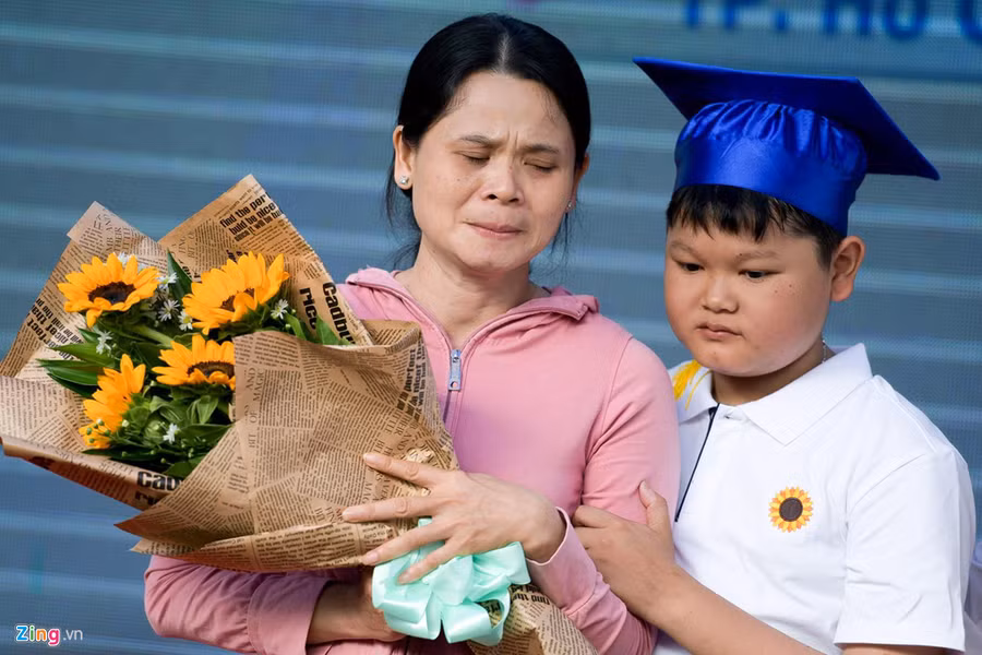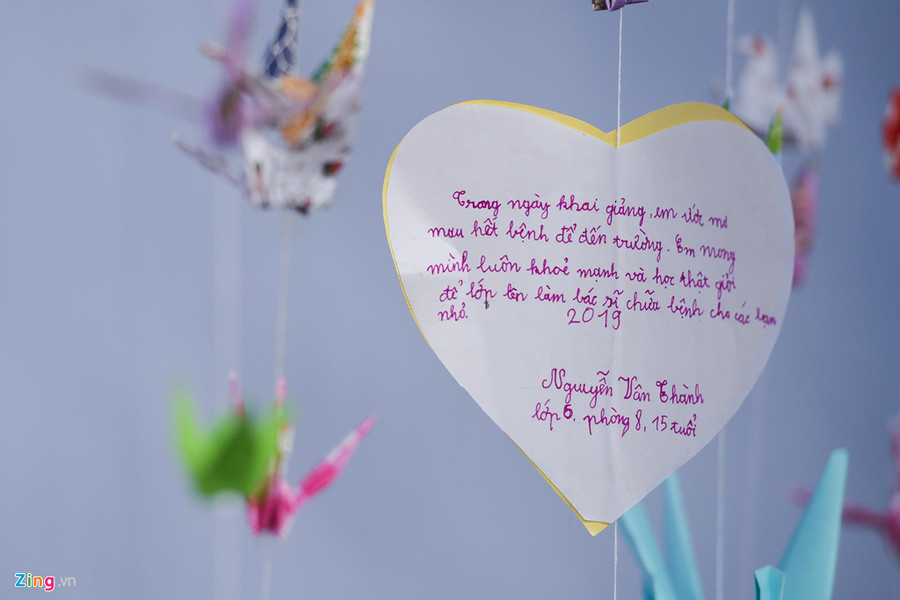 Lê Quang Trường gắn bó với lớp học chữ trong khoa Nội Nhi suốt 10 năm qua. Tại lễ khai giảng, chị Mai Chi, mẹ Trường, không cầm nổi nước mắt khi nhớ lại những ngày đầu con theo lớp, vừa luyện viết vừa chịu đựng cơn đau do điều trị ung thư máu. Chị cảm thấy được an ủi rất nhiều khi con trai được trải qua tuổi thơ đến lớp, không trọn vẹn nhưng vẫn có tiếng cười, niềm hân hoan.