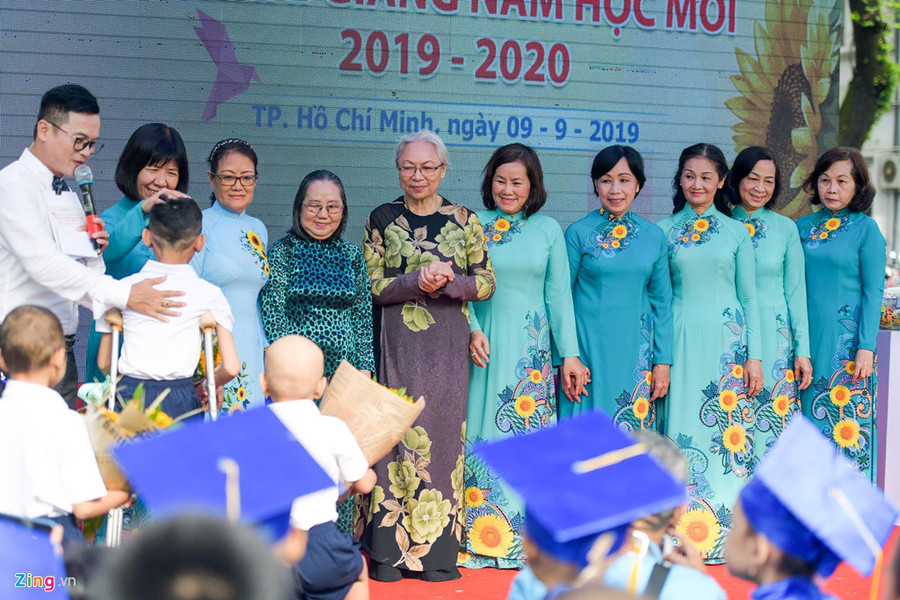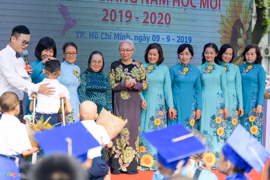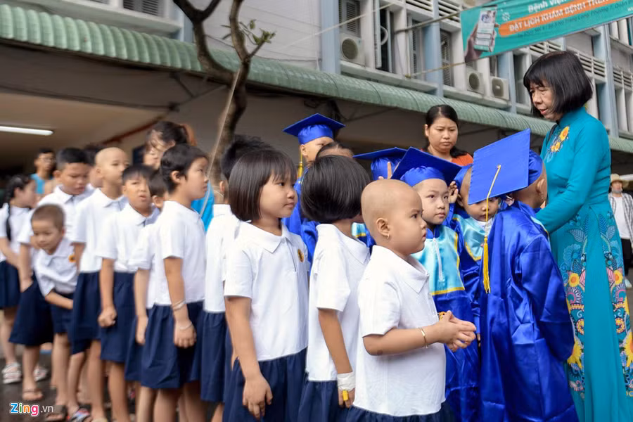 Bệnh nhi Bệnh viện Ung bướu TP.HCM dự lễ khai giảng với khát khao đến trường và tiếp tục mong ước về tương lai, dù vết mổ chưa liền hẳn và cần người dìu để bước đi.