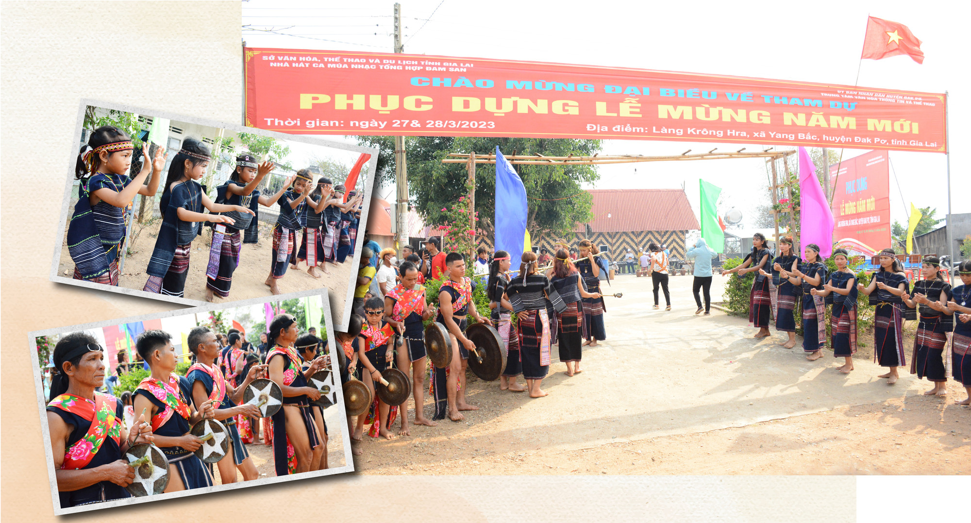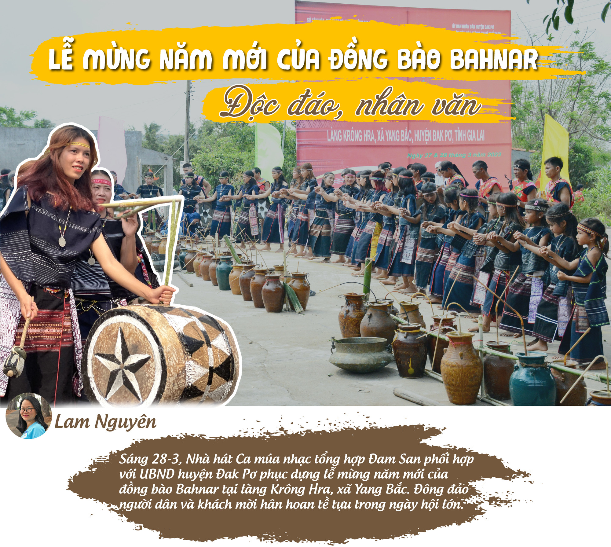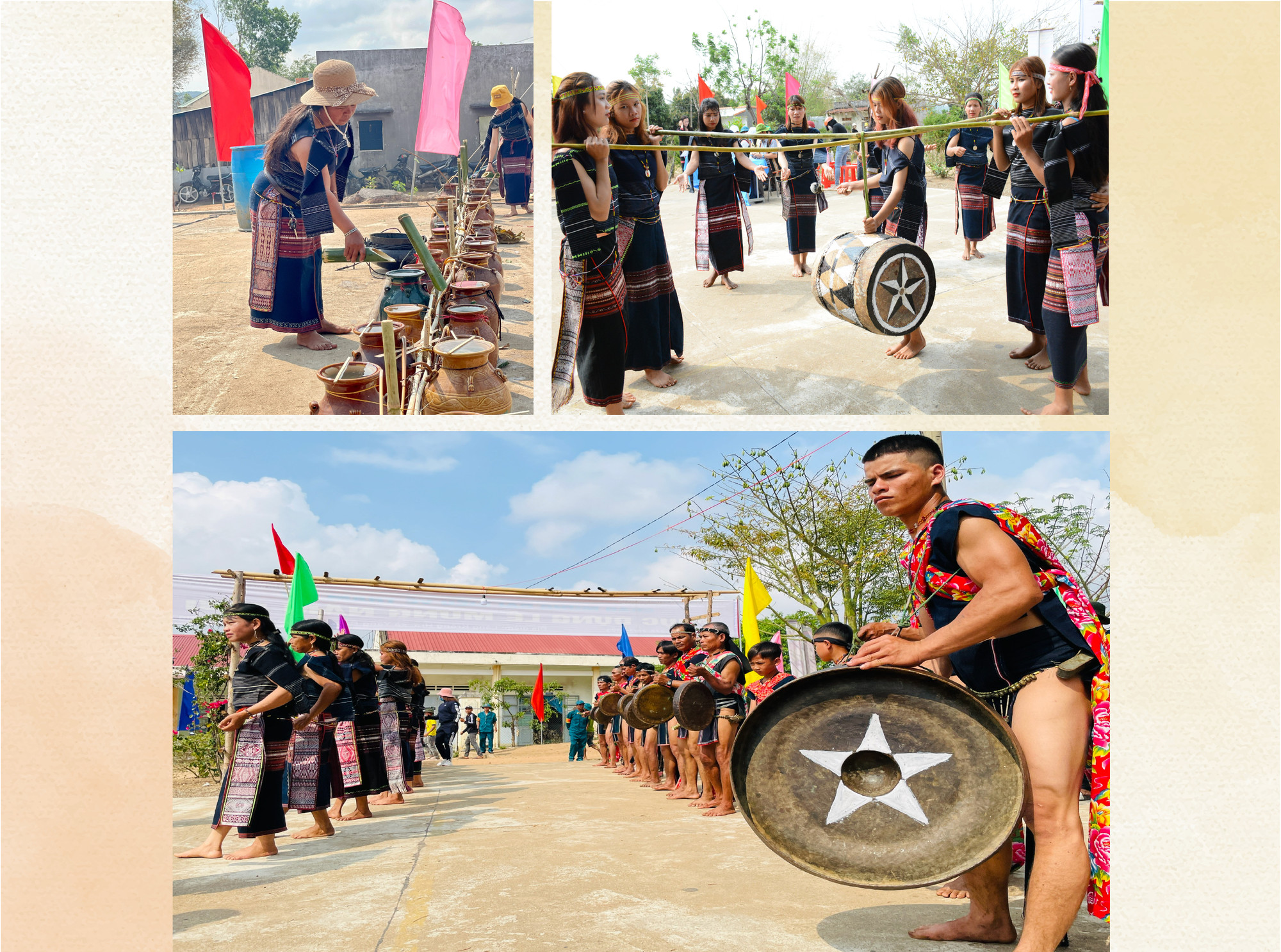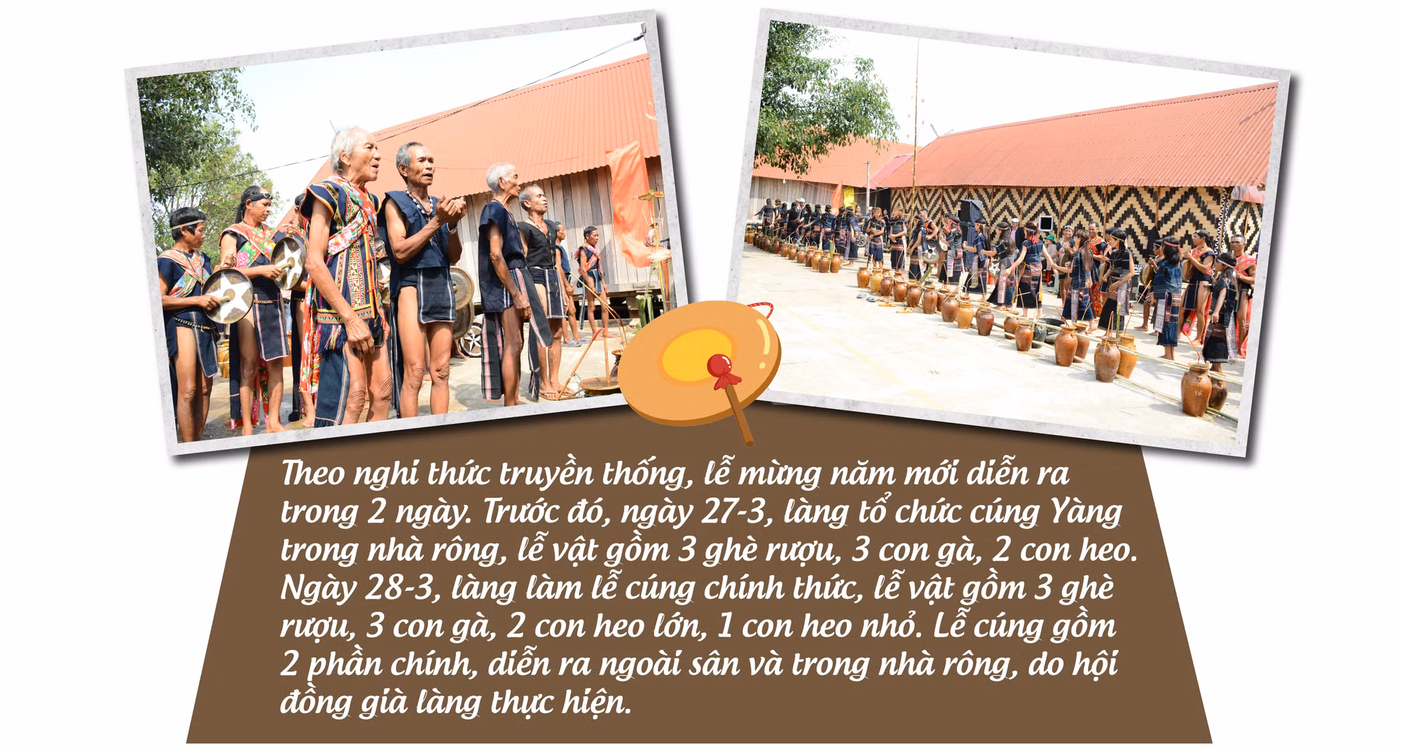 Từ sáng sớm, dân làng Krông Hra đã xúng xính trong những bộ trang phục thổ cẩm truyền thống để chuẩn bị cho một trong những nghi lễ lớn nhất trong năm. 45 thành viên đội cồng chiêng và múa xoang đủ lứa tuổi, già trẻ, lớn bé nhanh nhẹn tập trung trước sân nhà rông với những chiêng trống. Rượu ghè thành từng cặp xếp hàng dài cả chục mét. Không khí lễ hội miên man chảy tràn trong mùa “ăn năm uống tháng”. Trò chuyện cùng chúng tôi, em Đinh Thị Chi (9 tuổi) cho hay: “Em tham gia tập luyện cùng đội cồng chiêng “nhí” đã 2 năm nay. Mỗi lần được khoác lên mình trang phục thổ cẩm để biểu diễn, em thấy mình rất đẹp”.