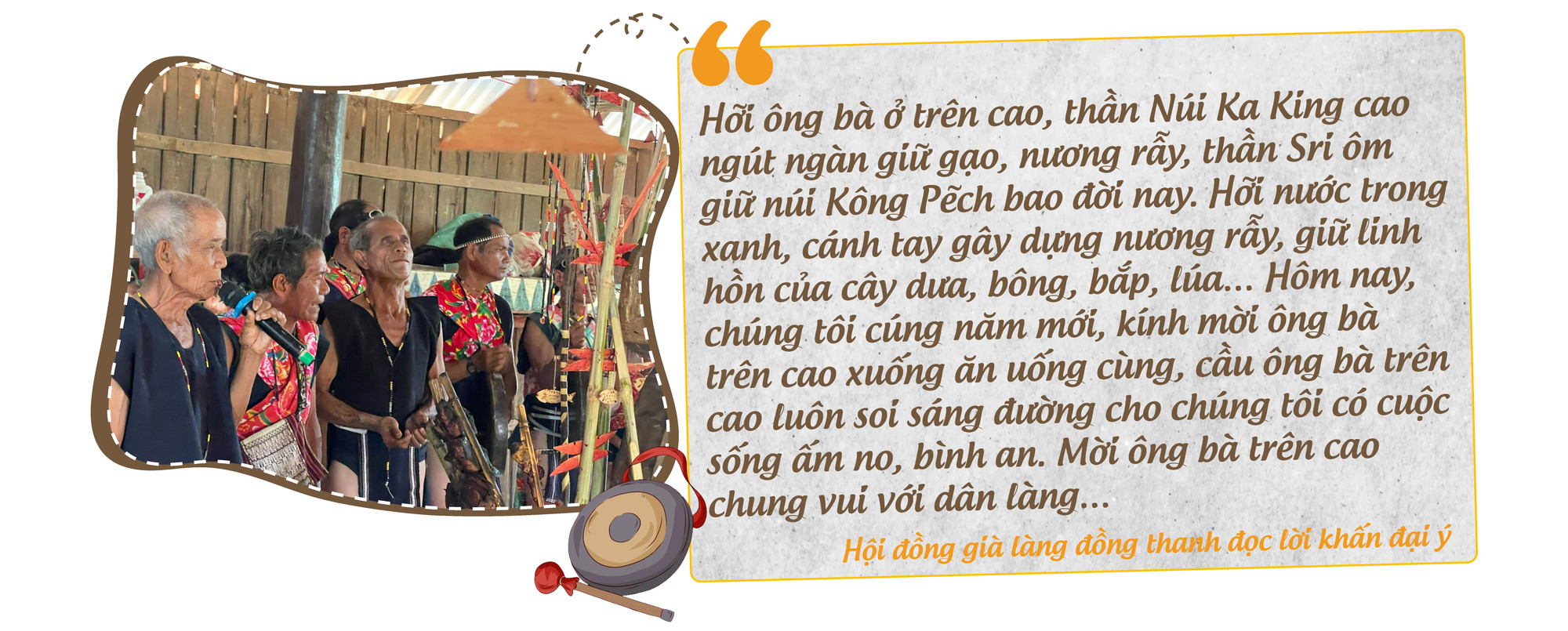 Trước biểu tượng thông linh là cây nêu cao vút, lời khấn tiếp tục được gửi đến các thần: “Bây giờ, chúng tôi gọi các thần chỉ đường dẫn lối cho dân làng không làm phải chỗ đất xấu, chọn được chỗ đất tốt để làm ăn, sinh sống luôn suôn sẻ. Hôm nay, chúng tôi cúng năm mới để cầu mong tất cả dân làng được bình an, ấm no. Từ trẻ nhỏ đến người già đừng để đau ốm, bệnh tật, đừng để chết chóc. Xin hãy luôn theo dõi, đem lại cho chúng tôi cái ăn, cái uống, có của để dành quanh năm, suốt tháng…”.