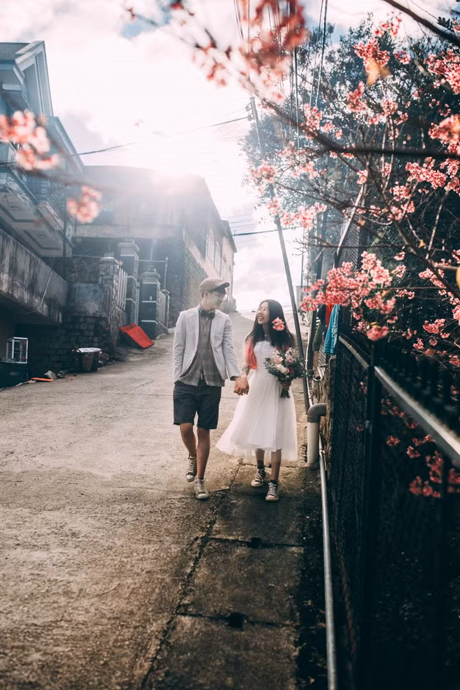 Chỉ cần tạo dáng đơn giản dưới tán mai anh đào, bạn sẽ có những bức ảnh đẹp không khác gì chụp ở xứ phù tang. Nhiều đôi cũng tranh thủ dịp này để chụp ảnh cưới.