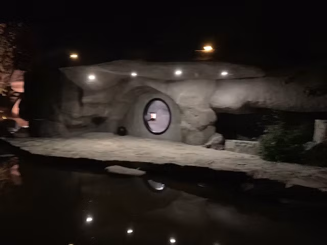 Khu Đặng Lê Nguyên Vũ ở cách chỗ chúng tôi khoảng hơn 1 km. "Đúng 6 giờ 45 mình xuất phát nhé" - anh Sơn (người quản lý trang trại) dặn nghiêm cẩn. Thế nhưng 6 giờ 40 xe đã đỗ xịch trước cửa. Đêm ở M'Drắk đến rất nhanh, mới nắng rực rỡ mà lúc này bóng tối đã phủ trùm lên trang trại. Thời tiết se lạnh, gió hun hút, thỉnh thoảng có tiếng côn trùng kêu văng vẳng nghe hoang hải. "Tối nay Chủ tịch sẽ tiếp chị ở một nơi đặc biệt, nhà hang ạ" - cô nhân viên đi cùng thông báo. "Nhà hang là gì vậy? nghe lạ quá?" "Dạ, chị cứ tới sẽ biết ạ" - cô nhân viên vẫn kiệm lời khi nói đến Chủ tịch của mình. Chiếc xe lao vào bóng tối, tôi căng mắt nhưng không nhìn rõ cảnh vật bên ngoài. Trời tối đen như mực. Bỗng có ánh đèn nhá thẳng vào xe chúng tôi rồi vụt tắt. "Xe an ninh báo hiệu đã thấy chúng ta" - anh Sơn giải thích. Tất nhiên, sự có mặt của chúng tôi đã được báo trước. Đi thêm một đoạn nữa thì xe dừng lại, tắt máy. "Chúng ta đi bộ vào để giữ yên tĩnh" - có tiếng giải thích. Tôi dò dẫm từng bước lên con dốc gồ ghề sỏi đá. Đến gần đỉnh đồi, tôi được ra hiệu rẽ xuống lối đi có bậc thang. Trời vẫn tối đen, cả khu vực này không một ánh đèn. Sợ hụt chân, tôi lấy điện thoại ra soi đường nhưng ngay lập tức được nhắc nhở tắt máy và "tốt nhất thì bỏ điện thoại bên ngoài, không thì phải để chế độ im lặng. Tuyệt đối không để chuông". Thế là lại dò dẫm. Đi hết bậc thang dẫn tới một hồ nước hình chữ nhật, ánh sáng bàng bạc từ đâu đó hắt xuống mặt hồ yên lặng như tờ. "Cửa hang phía bên kia hồ, chị đi theo hướng đó" - cô nhân viên chỉ tay. Tôi men dọc theo hồ nước, khung cảnh tĩnh mịch đến nổi gai ốc. Hồ không lớn lắm, lát đá tự nhiên. Đối diện phía bên kia hồ là một vách đá, ở chính giữa khoét một ô tròn có cánh cửa viền đen đã mở sẵn. Phía trên, một tảng đá lớn chồm hẳn ra ngoài, ôm lấy cửa hang như cái mái hiên. Trên "mái hiên" có mấy chiếc đèn tròn nhỏ, lõm vào trong đá phát ra ánh sáng bàng bạc, liêu trai. Không gian tĩnh mịch, im lặng đến mức tôi nghe cả thấy tiếng thở của mình. Bỗng văng vẳng tiếng nước chảy, như phát ra từ một con suối ở đâu đó. Tôi ngó quanh, không thấy gì, nên lại hướng cửa hang đi tiếp. Sang đến bờ bên kia, mới phát hiện một miệng hang khác tối om, tiếng róc rách phát ra từ trong đó. Âm thanh càng khiến đêm núi rừng M'Drak như cô đặc, u minh. Cửa hang chính cũng nằm kế ngay đó. Tôi quay lại phía sau, không còn thấy anh Sơn và cô nhân viên đi cùng. Họ đã rút lui từ lúc nào không biết. Sự tò mò khiến tôi không kịp suy nghĩ nhiều, nhấc chân bước lọt thỏm vào trong hang.