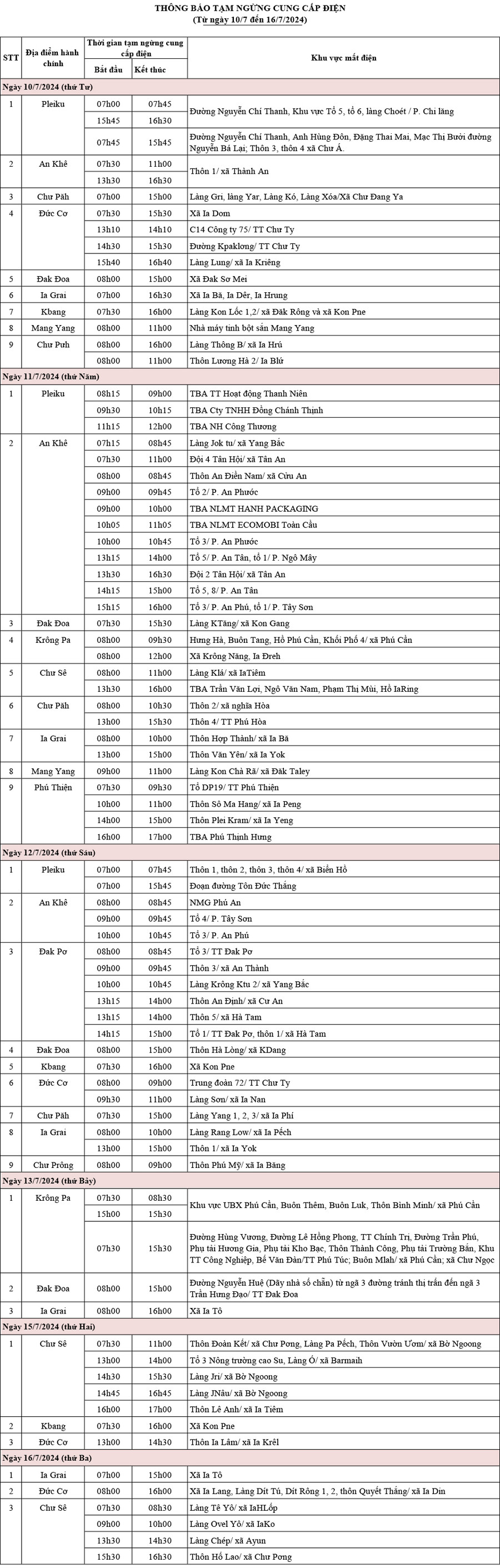 (GLO)- Báo Gia Lai đăng tải thông báo lịch cúp điện tại các huyện, thị xã trong tỉnh Gia Lai từ ngày 10 đến 16-7.