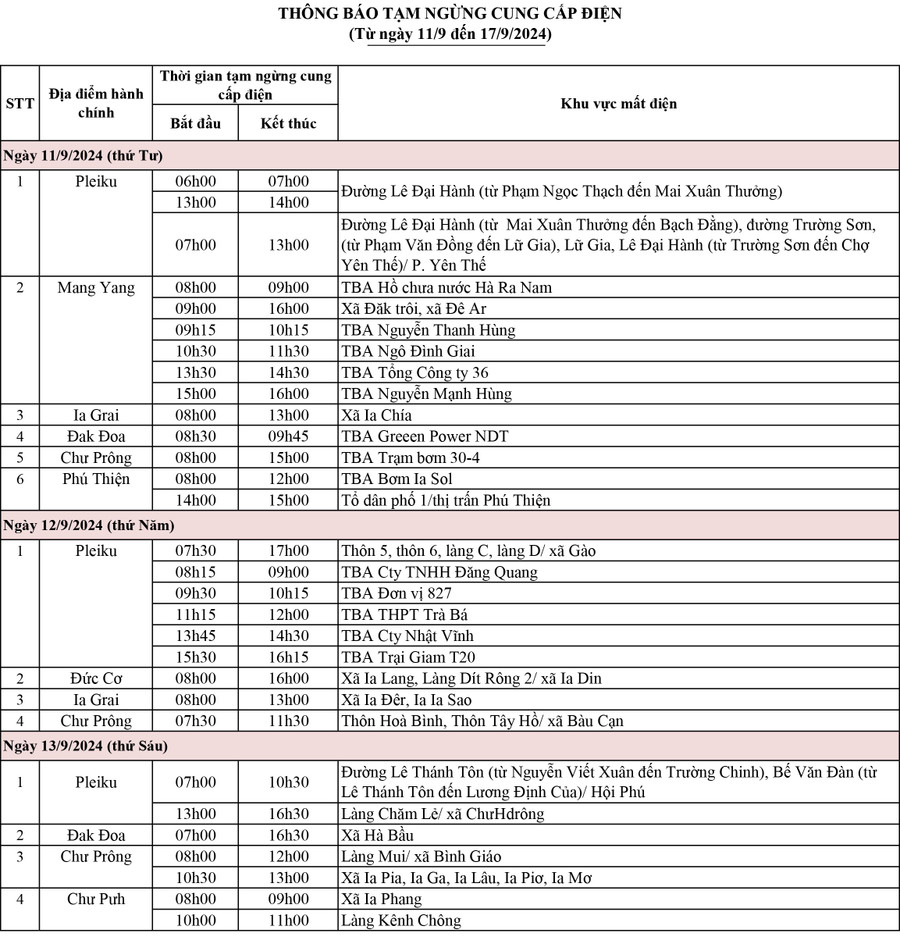 (GLO)- Báo Gia Lai đăng tải thông báo lịch cúp điện tại các huyện, TP. Pleiku từ ngày 11 đến 13-9.