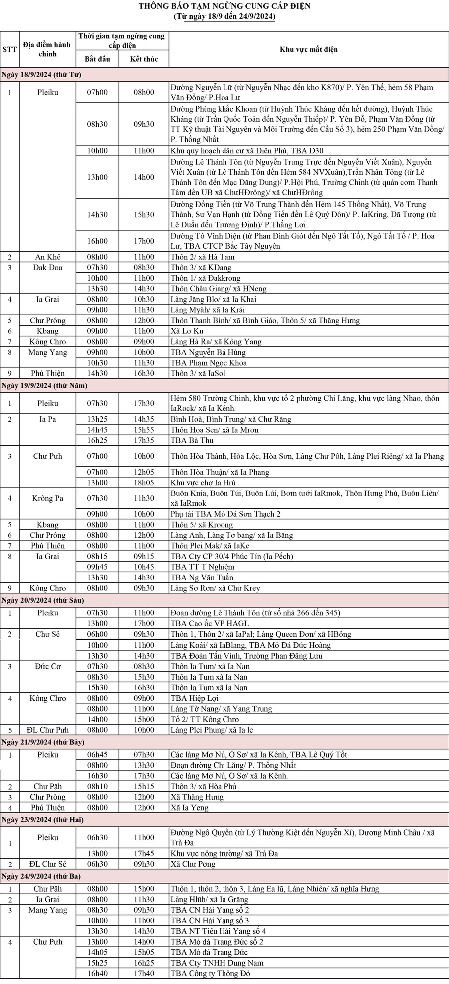 (GLO)- Báo Gia Lai đăng tải thông báo lịch cúp điện tại các huyện, thị xã, TP. Pleiku từ ngày 18 đến 24-9-2024.