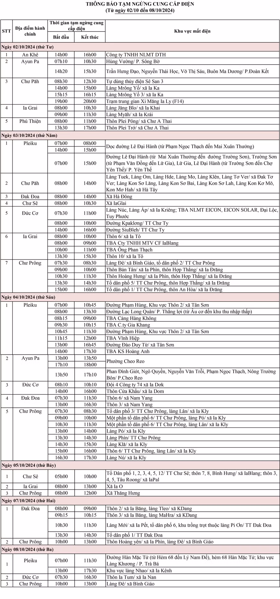 (GLO)- Báo Gia Lai đăng tải thông báo lịch cúp điện tại các huyện, thị xã và TP. Pleiku từ ngày 2 đến 8-10-2024.