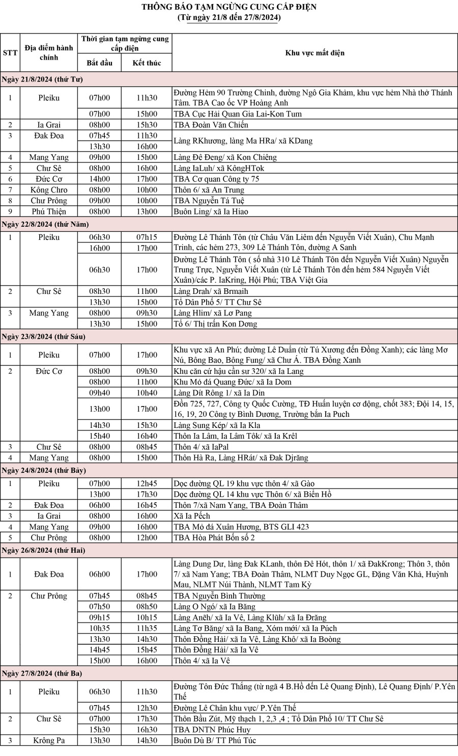 (GLO)- Báo Gia Lai đăng tải thông báo lịch cúp điện tại các huyện và TP. Pleiku từ ngày 21 đến 27-8-2024.