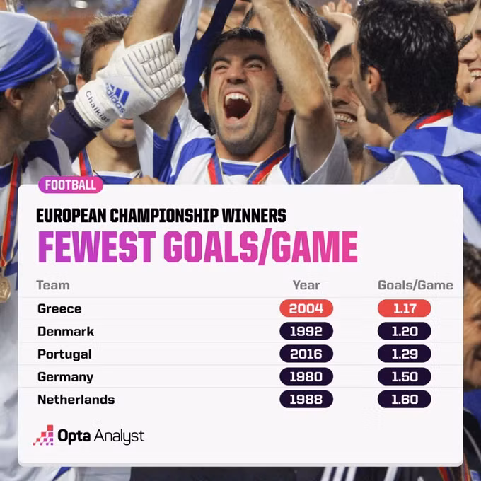 Hy Lạp đã lập nhiều kỷ lục trên đường nâng cao cúp vô địch. Họ đã vô địch Euro 2004 khi ghi ít bàn thắng mỗi trận nhất so với bất kỳ nhà vô địch nào trong kỷ nguyên hiện đại (1,17 bàn). Họ cũng vô địch giải đấu với tỷ lệ cầm bóng trung bình là 40% - đó là mức thấp nhất trong lịch sử đối với một nhà vô địch. Tất cả các trận thắng của Hy Lạp ở vòng loại trực tiếp đều diễn ra theo cách giống nhau: chiến thắng 1–0, với bàn thắng là cú đánh đầu từ đường tạt bóng từ cánh phải.