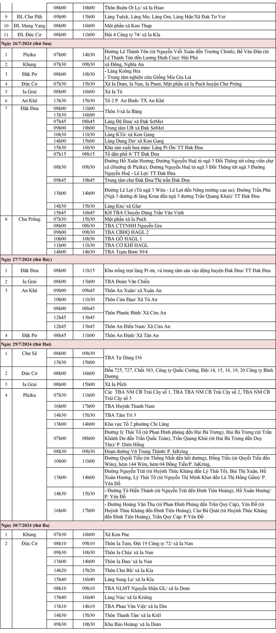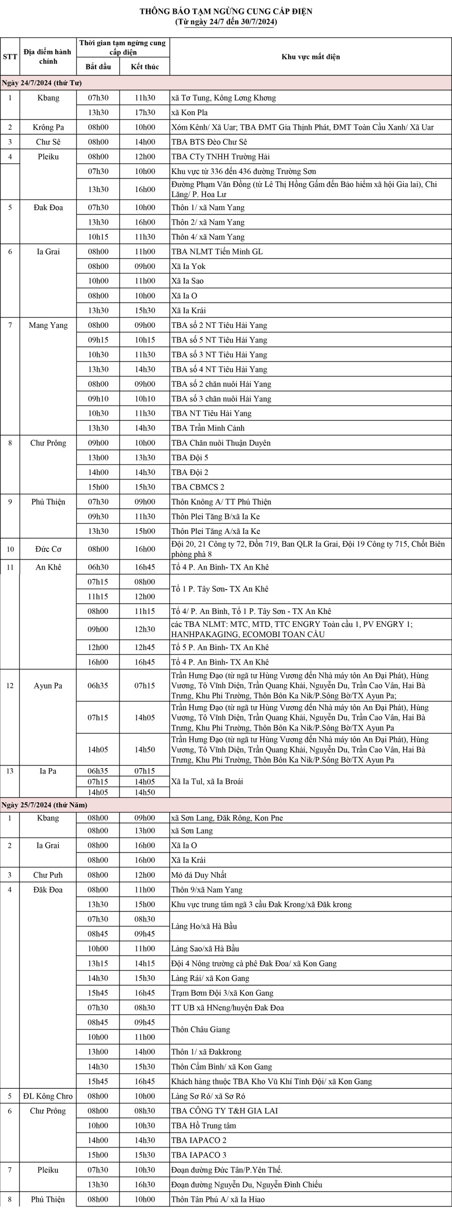 (GLO)- Báo Gia Lai đăng thông báo lịch tạm ngừng cung cấp điện tại một số huyện, thị xã, thành phố trong tỉnh từ ngày 24 đến 30-7-2024.