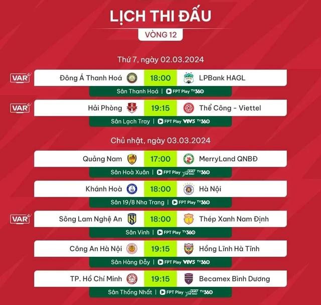 Lịch thi đấu vòng 12 V-League 2023-2024: