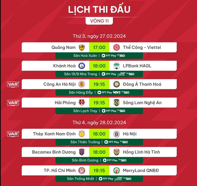 Lịch thi đấu và trực tiếp vòng 11 V-League 2023-2024: