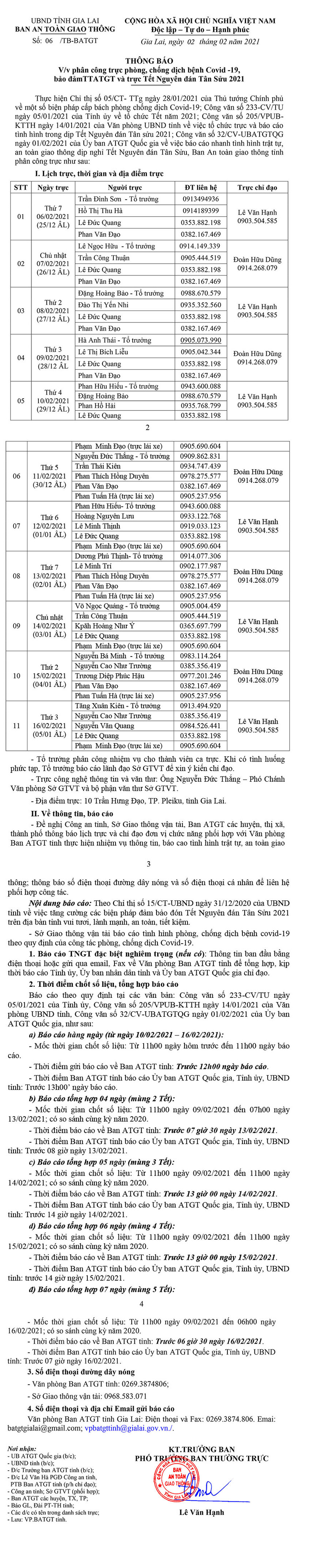 (GLO)- Ban An toàn Giao thông của UBND tỉnh Gia Lai vừa có Thông báo số 06/TB-BATGT ngày 2-2-2021 về việc phân công phòng-chống dịch bệnh Covid-19 bảo đảm trật tự an toàn giao thông và trực Tết Nguyên đán Tân Sửu 2021.