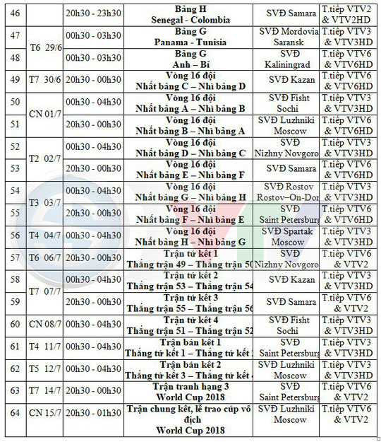 Sau đây là lịch tường thuật trực tiếp 64 trận đấu trên các kênh sóng của VTV: