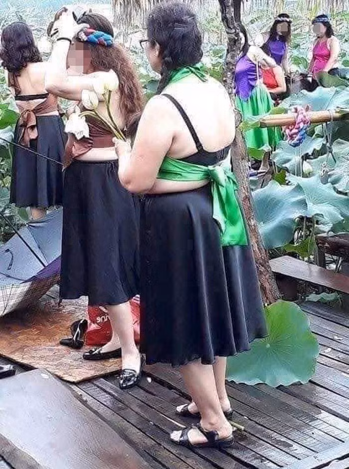 Ngày 11/6, hình ảnh chụp lén từ phía sau nhóm phụ nữ trung niên ở đầm sen cũng gây nhiều chú ý. Trang phục áo yếm, váy đụp nhóm nữ này mặc được nhận xét là hở hang, không phù hợp với lứa tuổi.
