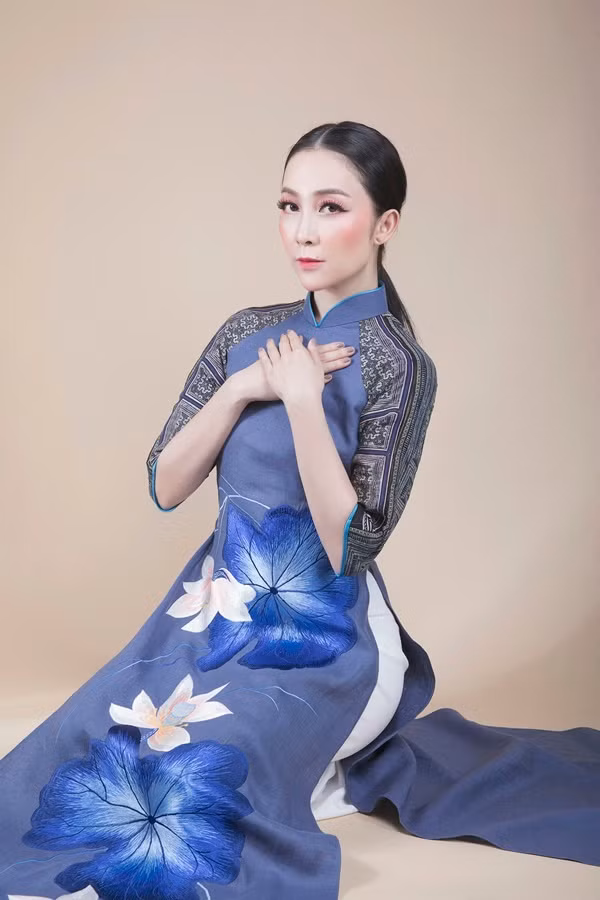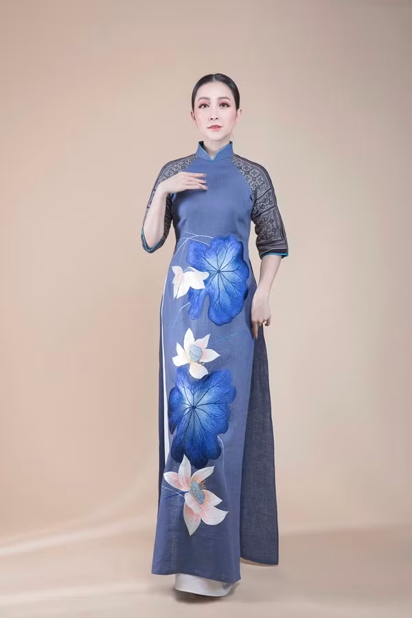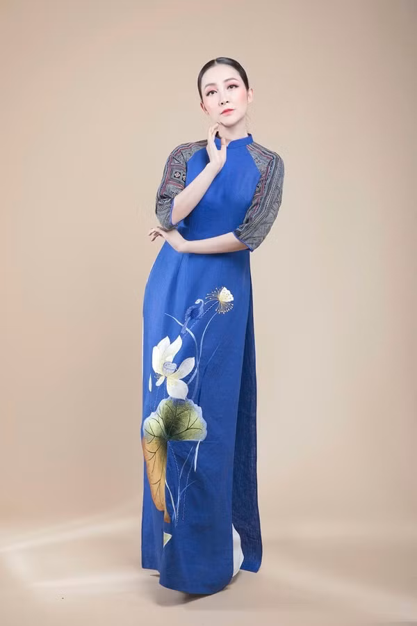 Một thiết kế tông xanh lam thêu hoa và đắp vải thổ cẩm ở cánh tay với phần cổ trụ truyền thống.