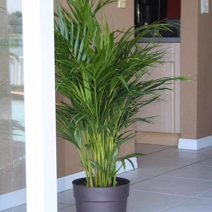 Một trong những loại cây chưng ở phòng khách phổ biến là cau cảnh. Chúng tạo độ ẩm không khí một cách tự nhiên. Cây cau cảnh còn có thể lọc benzen, formaldehyd và trichloroen trong không khí.