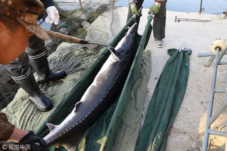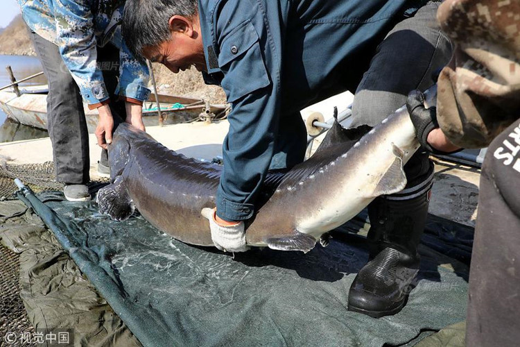 Tại sông Áp Lục, tỉnh Liêu Ninh, Trung Quốc, ngư dân địa phương đã phát hiện một con cá tầm khổng lồ, dài gần 2m, nặng hơn 60kg.