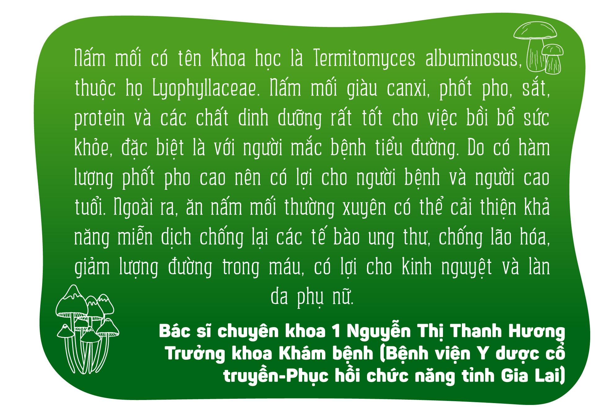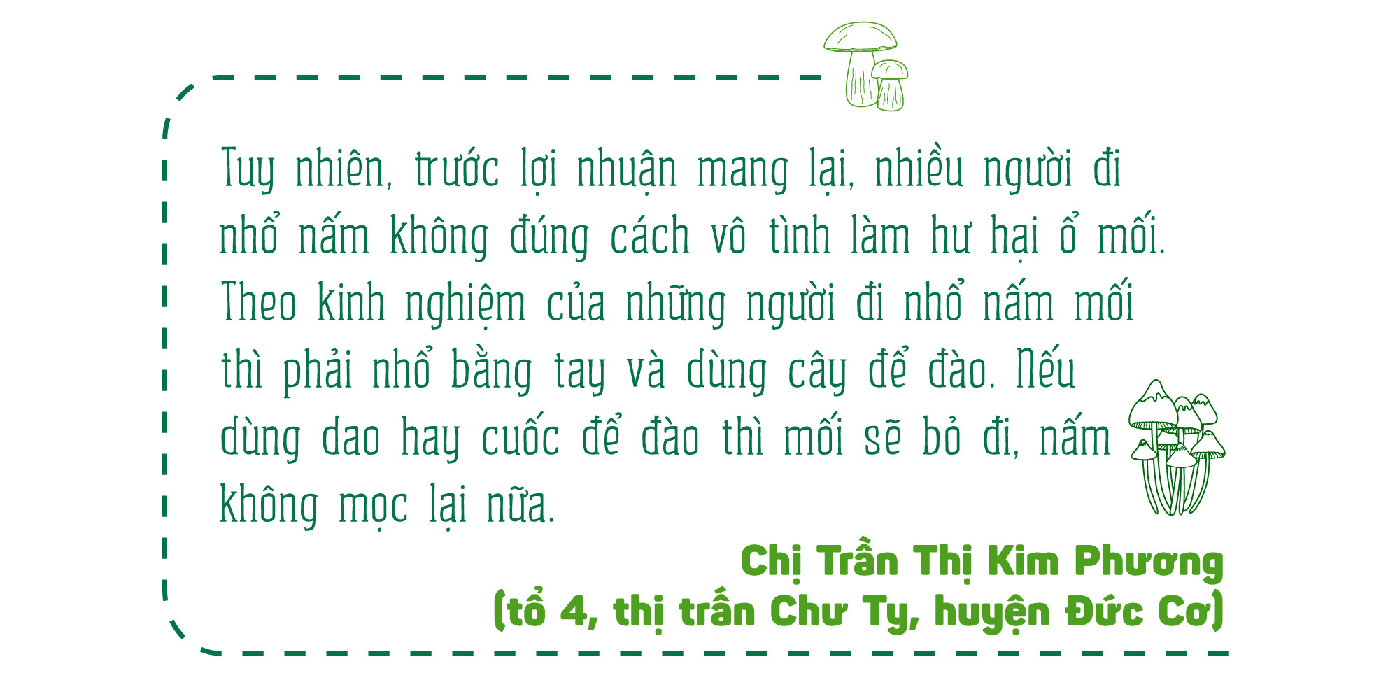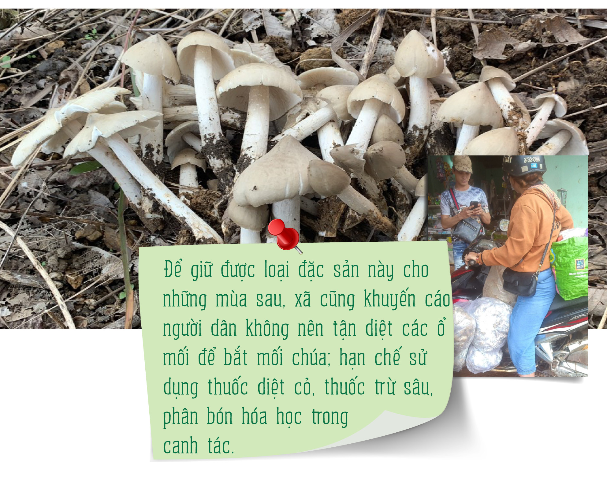 “Đối với những vùng thường xuyên có nấm, hàng năm, phần lớn người dân đều đến để thu hái. Do vậy, chúng tôi thông tin đến người dân khi khai thác phải cẩn thận, tránh làm hư hại các bào tử để mùa sau nấm còn mọc lại. Còn với những vườn điều, cà phê thì định hướng người dân nên canh tác theo hướng hữu cơ để tạo điều kiện cho nấm mối mọc nhằm bảo tồn nguồn đặc sản của địa phương”-Trưởng phòng Nông nghiệp và PTNT huyện Đức Cơ khuyến cáo.