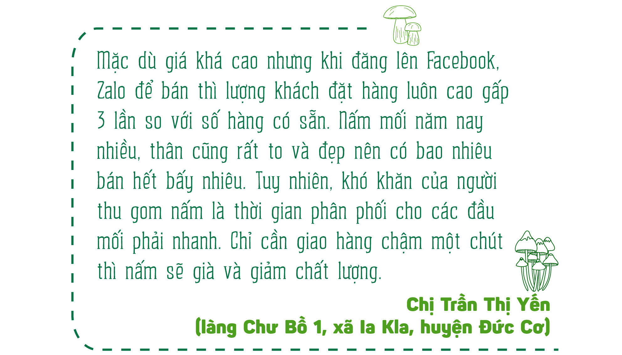 Chị Trần Thị Yến (làng Chư Bồ 1, xã Ia Kla, huyện Đức Cơ) chuyên thu mua nấm mối của người dân trên địa bàn huyện để xuất đi nơi khác. Chị cho biết: Từ đầu mùa mưa đến nay, chị đã thu mua trên 5 tạ nấm mối xuất đi Bà Rịa-Vũng Tàu, TP. Hồ Chí Minh với giá 400 ngàn đồng/kg nấm đinh và 300 ngàn đồng/kg nấm búp.
