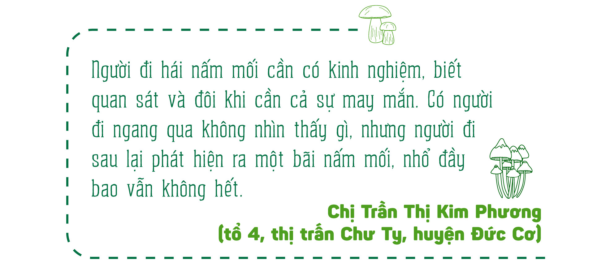 Tầm 3 giờ sáng, chị Trần Thị Kim Phương (tổ 4, thị trấn Chư Ty, huyện Đức Cơ) lại len lỏi giữa các vườn điều, cao su ở xã Ia Kriêng để tìm nấm mối. Chị cho hay: Mùa mưa năm nay, nấm mối mọc nhiều hơn các năm trước. Trung bình mỗi ngày, chị tìm nhổ được 2-3 kg nấm, ngày trúng đậm thì được đến 10 kg. “Nấm mối được chia thành nhiều loại khác nhau. Nấm đinh được thương lái thu mua với giá 300-350 ngàn đồng/kg. Nấm búp thì rẻ hơn chừng 50 ngàn đồng/kg so với nấm đinh, còn nấm dù có giá khoảng 200 ngàn đồng/kg. Riêng nấm đã nở to thì thương lái ít thu mua, tôi mang ra chợ bán được khoảng 50-60 ngàn đồng/kg”-chị Phương nói.