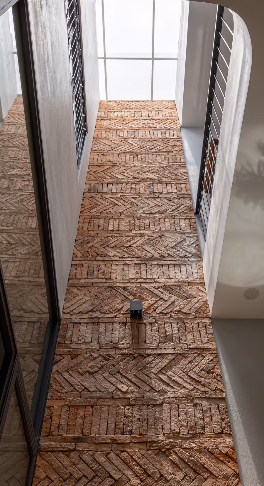 Phía trên tầng 2 là một phòng ngủ được đẩy ra mặt thoáng chính, không gian gian thờ gần gũi đặt cạnh giếng trời với một khoảng lùi đầy đủ ánh sáng. Giếng trời là diện tích hy sinh hiếm hoi trong ngôi nhà phố, nhằm nâng cao chất lượng không khí và môi trường sống cho các thành viên.