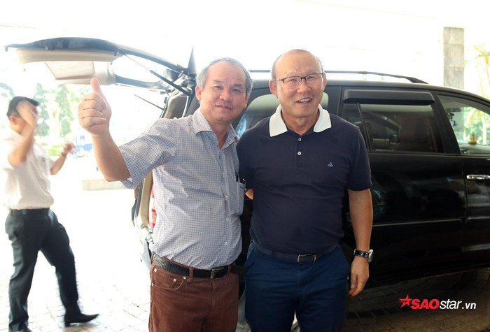 Vừa xuống xe, ông Park gấy ấn tượng mạnh khi mời bầu Đức chụp một tấm ảnh làm kỷ niệm.