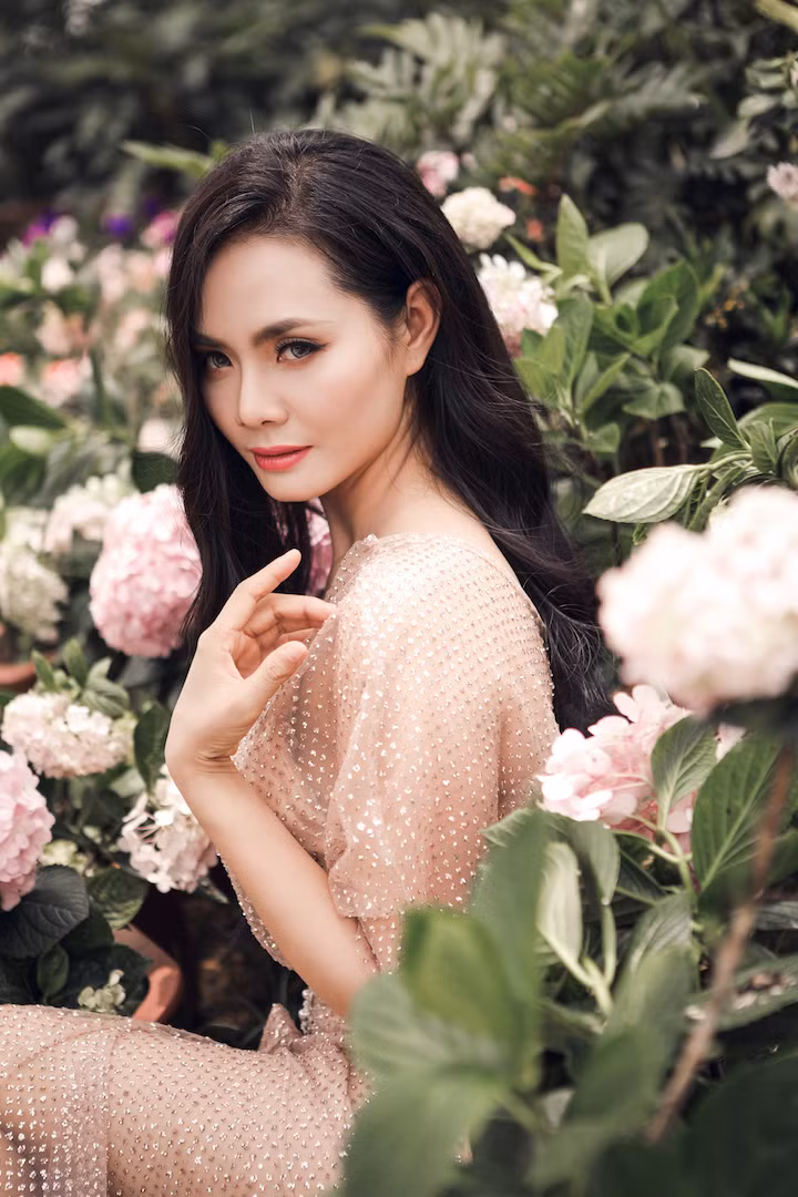 Nữ ca sĩ khoe hình ảnh quyến rũ với váy dạ hội màu nude lấp lánh giữa vườn hoa Cẩm tú cầu đang độ rực rỡ trong bộ hình mới.